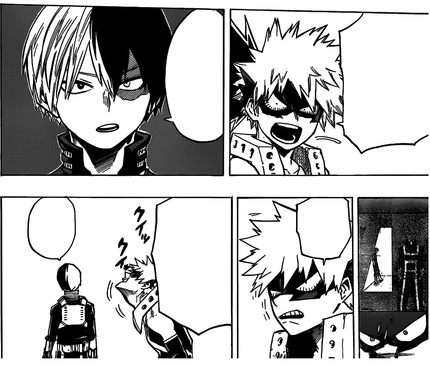 Como você pode conferir na imagem abaixo, enquanto Bakugo argumenta que talvez seja necessário usar um pouco de violência, Todoroki afirma que com certeza exista um jeito melhor de fazer isso. Mas antes de Bakugo concordar temos um breve flashback do Festival Esportivo.