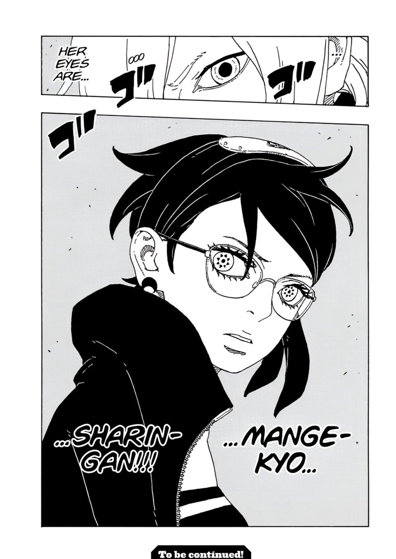 Sarada é filha de Sasuke Uchiha e Sakura Haruno, combinação genética inédita dentro do clã. A habilidade de controle preciso de chakra herdada de Sakura pode abrir espaço para uma nova rota evolutiva do dojutsu. Boruto Two Blue Vortex já demonstrou disposição para modificar regras estabelecidas do sistema de poderes, o que torna essa hipótese plausível.