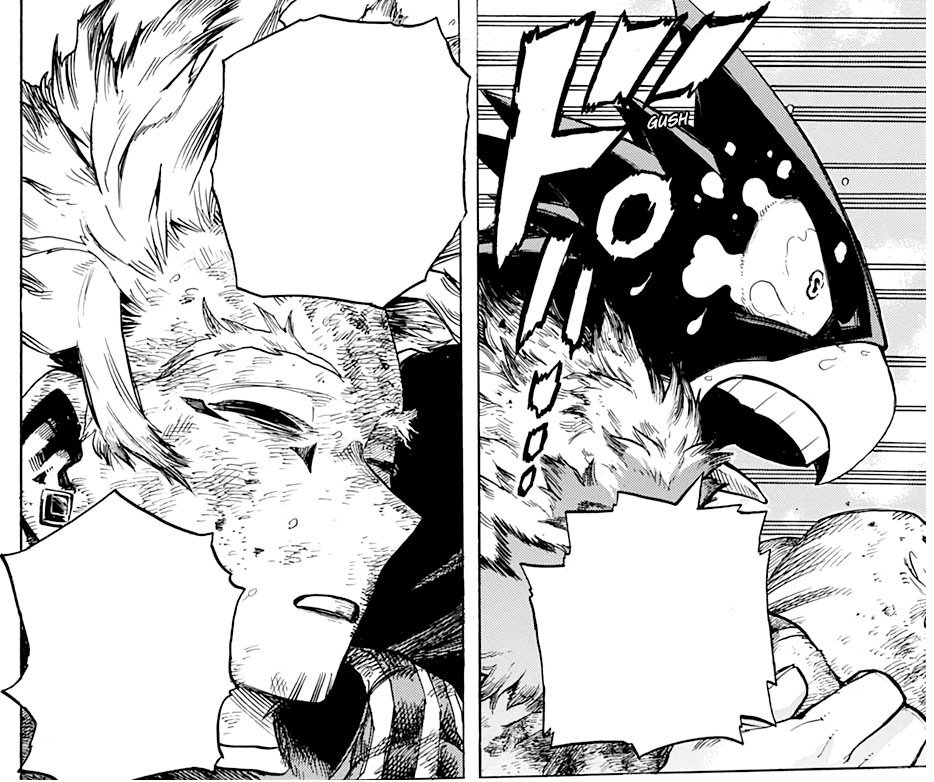 Continuando o momento que havia sido cortado no capítulo anterior, Tokoyami conseguiu sair da proteção de Fat Gum e rapidamente partiu para ajudar Hawks, encontrando o seu mentor em um estado quase inconsciente após ter grande parte das suas asas queimadas por Dabi.