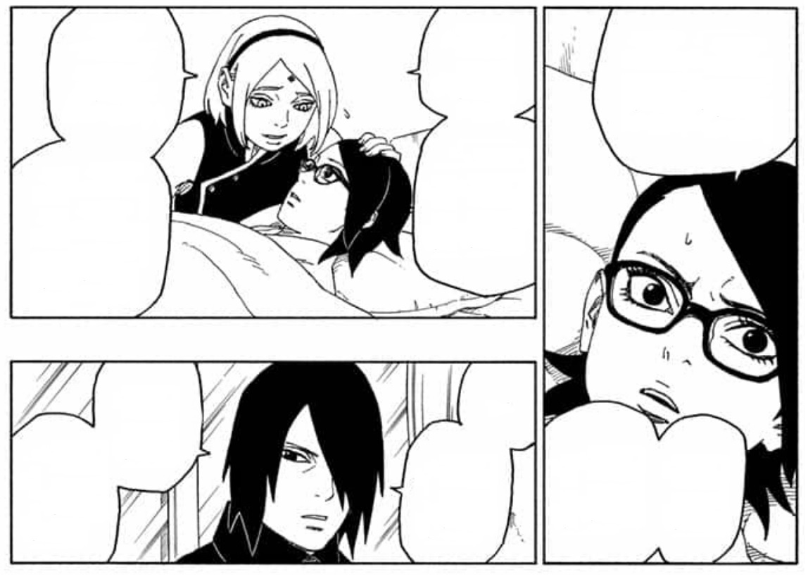 No entanto, como todo esse esforço a deixou bastante cansada, no capitulo 44 vemos que Sarada está descansando no hospital de Konoha, enquanto ao seu lado estão Sasuke e Sakura, protagonizando um adorável momento da família Uchiha.