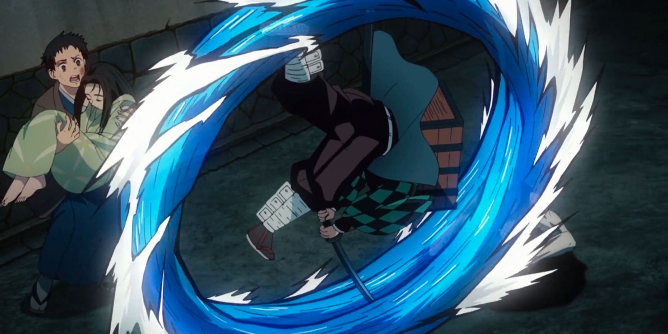 Ainda durante o teste para a entrada na Corporação dos Caçadores de Demônios, Tanjiro utilizou a Segunda Forma da Respiração da Água, em que ele salta e gira verticalmente no ar com a sua espada liberando um ataque em movimento circular.