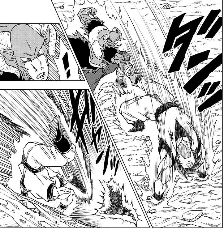 Dando um pouco mais de contexto, durante uma parte da sua luta contra Moro, Goku acaba tendo a sua perna agarrada pelo vilão, que o arremessa uma primeira vez contra o chão, mas quando tenta repetir o movimento Goku aproveita o impulso saltando para trás e se livrando do golpe.