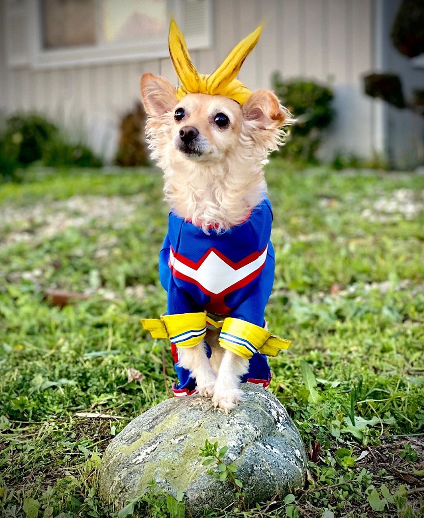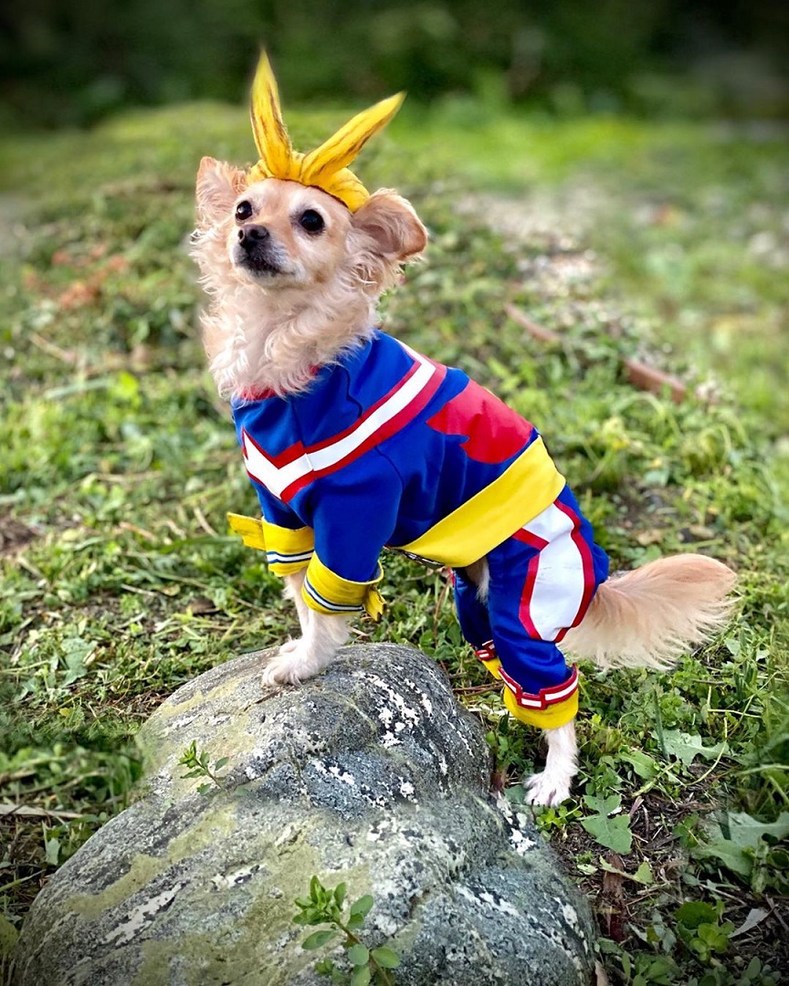 Como você pode conferir nas imagens acima, além da clássica roupa de herói de All Might ter caído muito bem no doguinho, o detalhe do seu cabelo para cima tornou o cosplay ainda mais perfeito e fofinho.