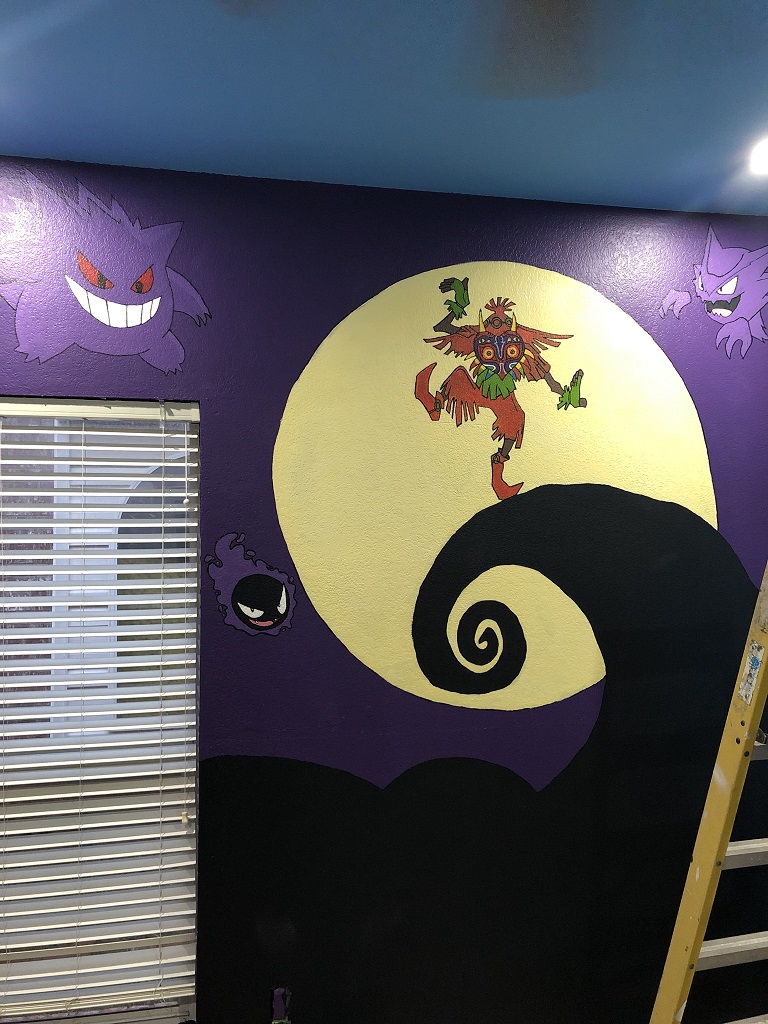 Como você pode conferir na imagem abaixo, o usuário mostrou uma parede que pintada homenageando diversos animes, como o Sem-Rosto de A Viagem de Chihiro, as nuvens da Akatsuki de Naruto, a Lua de Soul Eater, o Gato Preto de O Serviço de Entregas da Kiki e o Totoro de Meu Amigo Totoro.