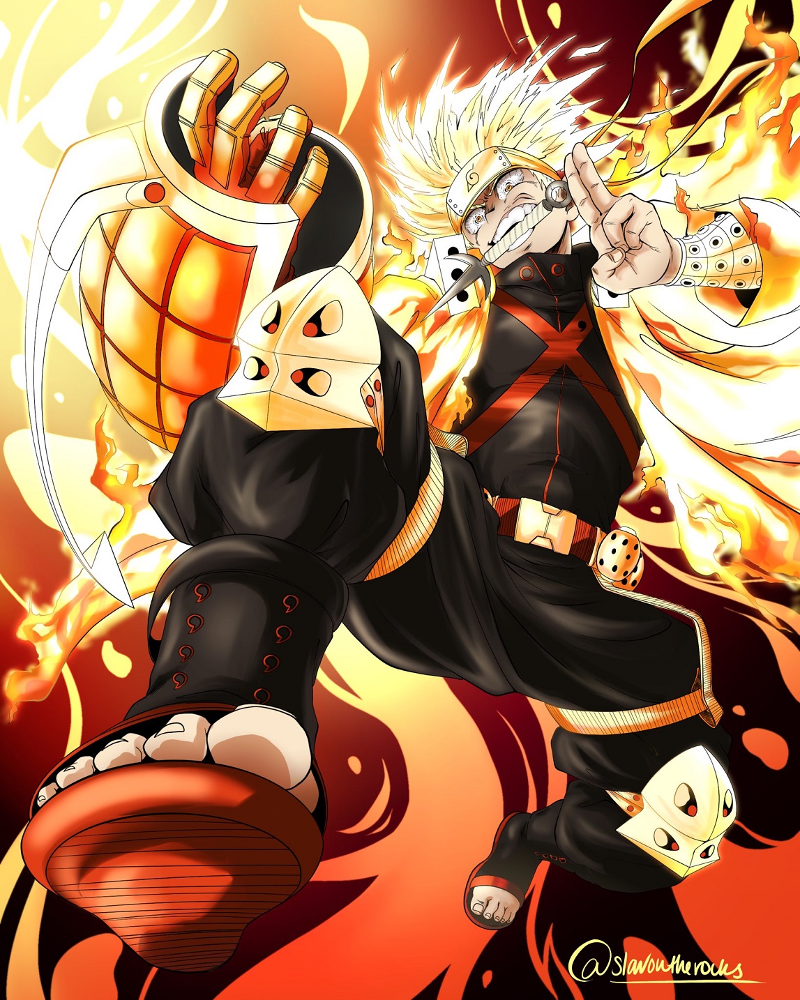 Além de um traço lindíssimo e uma combinação de cores simplesmente espetacular, o artista conseguiu unir de forma bem natural as principais características de cada um dos personagens, com o uniforme de Bakugo sendo envolto pelo manto de chakra da versão mais poderosa do Modo Sábio.