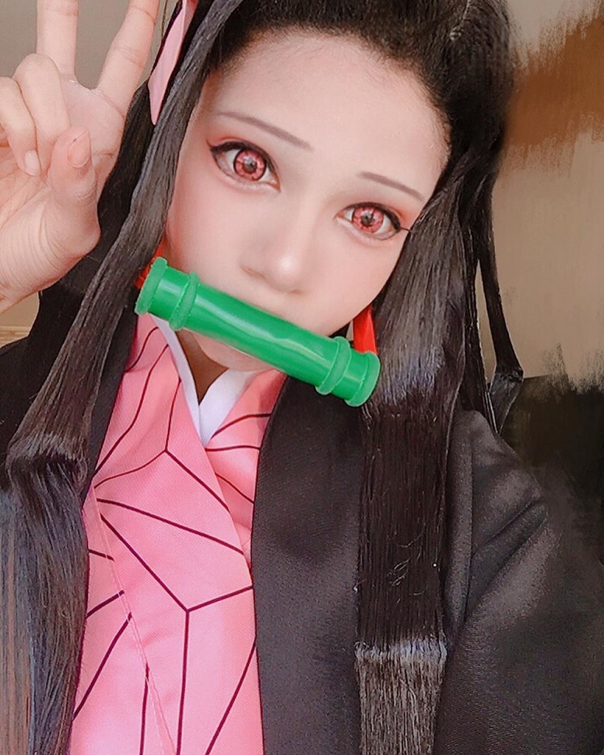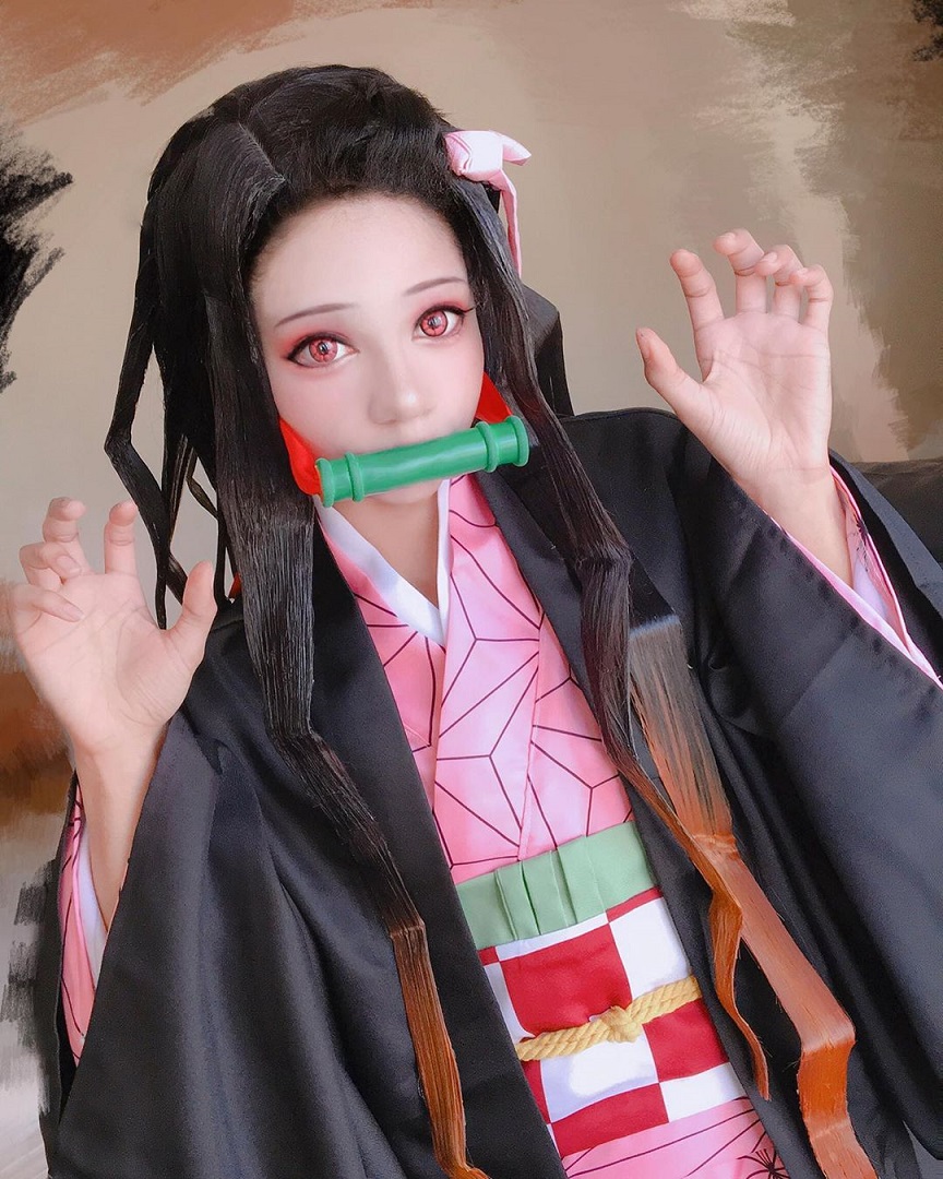 Como você pode conferir nas imagens acima, além de replicar com bastante fidelidade a roupa da personagem, que basicamente consiste em um quimono rosa com detalhes geométricos coberto com o haori preto, a parte mais impressionante do cosplay é a sua atenção aos detalhes, principalmente na reprodução do cabelo de Nezuko, ficando exatamente com a mesma aparência que vimos no mangá e anime.