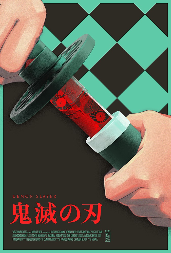 Como você pode conferir na imagem abaixo, o pôster traz em destaque o haori quadriculado verde e preto de Tanjiro, enquanto ele segura a sua Nichirin que tem um padrão de olhos na lâmina, referência que os leitores do mangá entenderão bem.