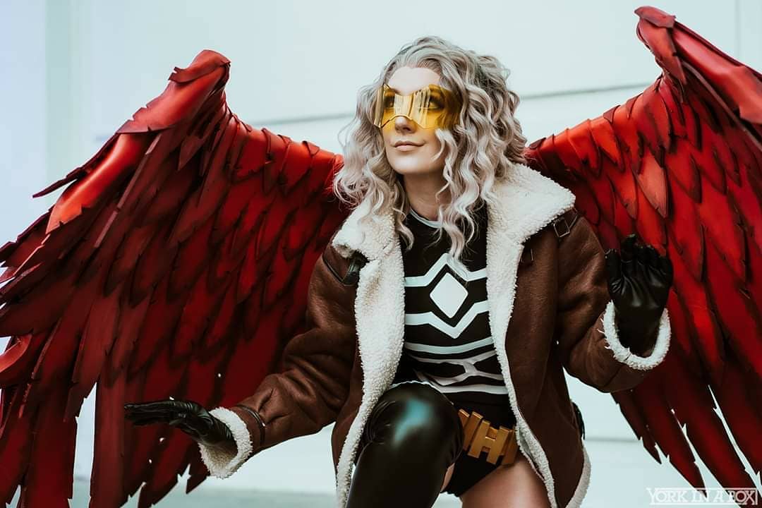 Como você pode conferir na imagem acima, a cosplayer não só recriou com bastante perfeição o visual de Hawks como fez algumas adaptações bem interessantes para o seu conceito dessa versão feminina, como substituir a sua camisa preta por um collant e a sua calça por meias longas.