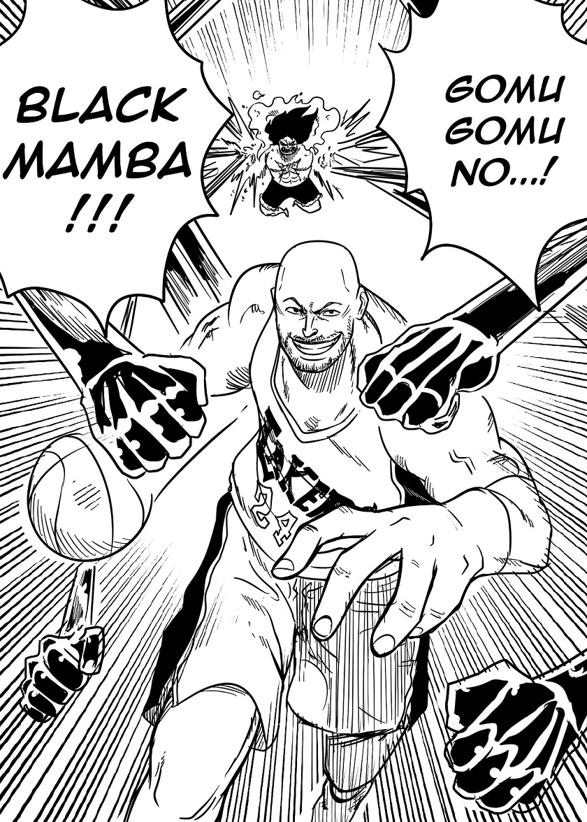 A escolha da ilustradora de desenhar Luffy utilizando justamente esse ataque faz bastante sentido, já que o apelido de Kobe era “Black Mamba”, nome por ele para representar o desejo que as suas habilidades no basquete fossem tão eficientes quanto o ataque de uma Mamba-negra