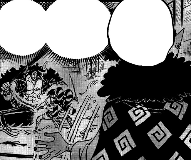 Mas além de termos a revelação de que na verdade Oden foi chantageado por Orochi para fazer aquelas dancinhas, em um dos quadros temos uma peculiar imagem de Kaido na sua forma humana, mostrando que antigamente ele com certeza falta o dia de perna na academia.