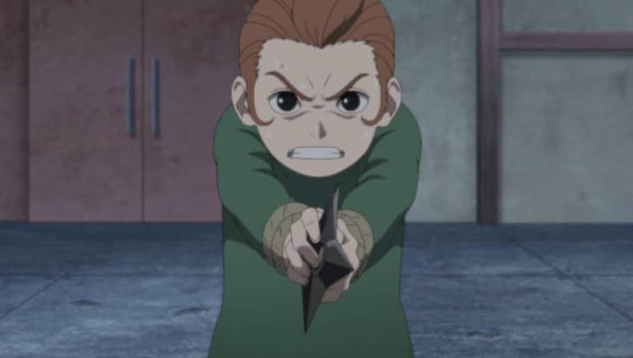 Como você pode conferir na imagem acima, a cena mostra Tento com as mãos amarradas e segurando uma shuriken, a arma que ele aprendeu a utilizar durante o seu breve treinamento ninja com Boruto.