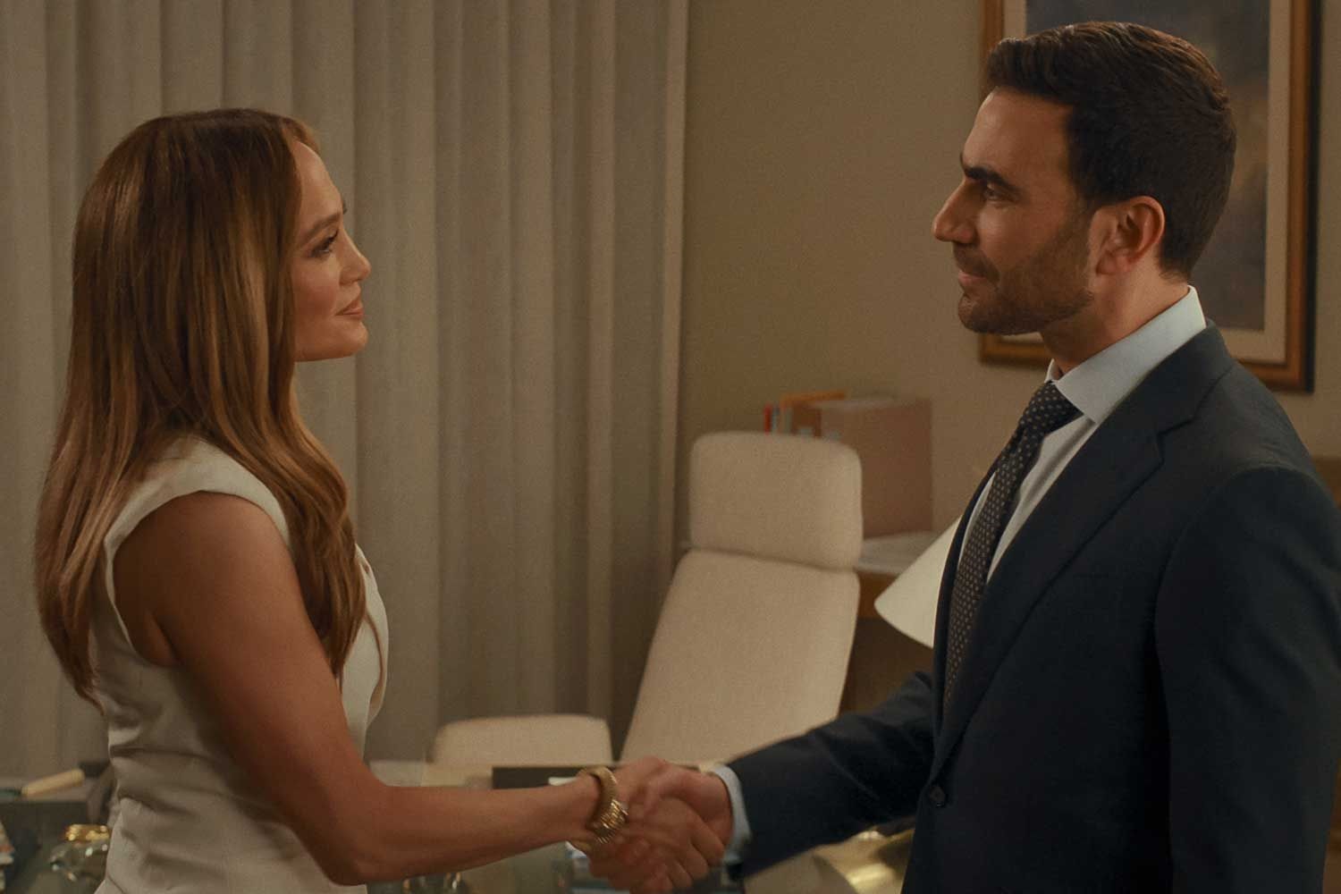 Paixão de Escritório também chama atenção por reunir dois nomes fortes do gênero em momentos diferentes de carreira. Jennifer Lopez retorna a um estilo de filme com o qual construiu parte de sua popularidade, após sucessos como Encontro de Amor, O Casamento dos Meus Sonhos e Marry Me. Já Brett Goldstein, conhecido mundialmente por Ted Lasso, amplia sua presença no cinema em um papel de protagonista romântico.