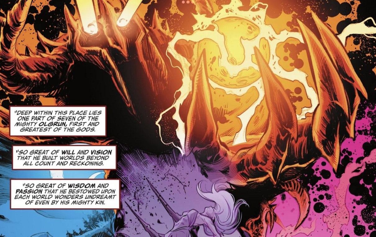 Entre os inimigos mais perigosos está Olgrun, um deus do Primeiro Mundo que enlouqueceu e destruiu tudo ao seu redor. Após séculos, sua influência retornou quando exploradores maltusianos profanaram seu túmulo, dando origem aos Radiant Dead, um exército de mortos-vivos cósmicos. Seu objetivo era possuir o corpo de John Stewart, que havia absorvido o poder de uma tempestade divina, tornando-se o hospedeiro perfeito para sua volta.