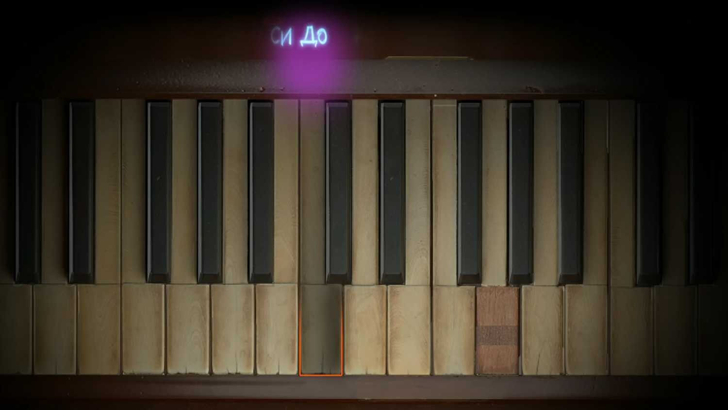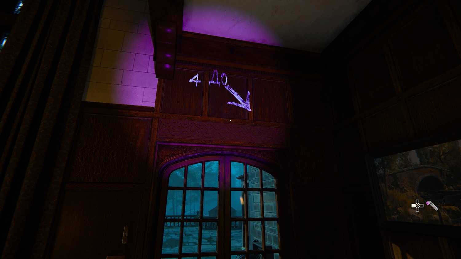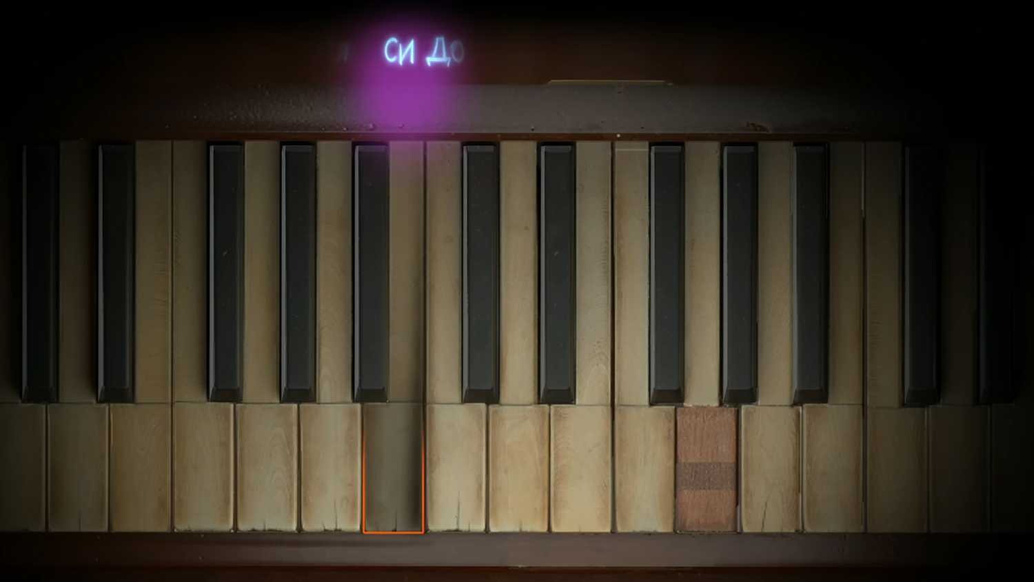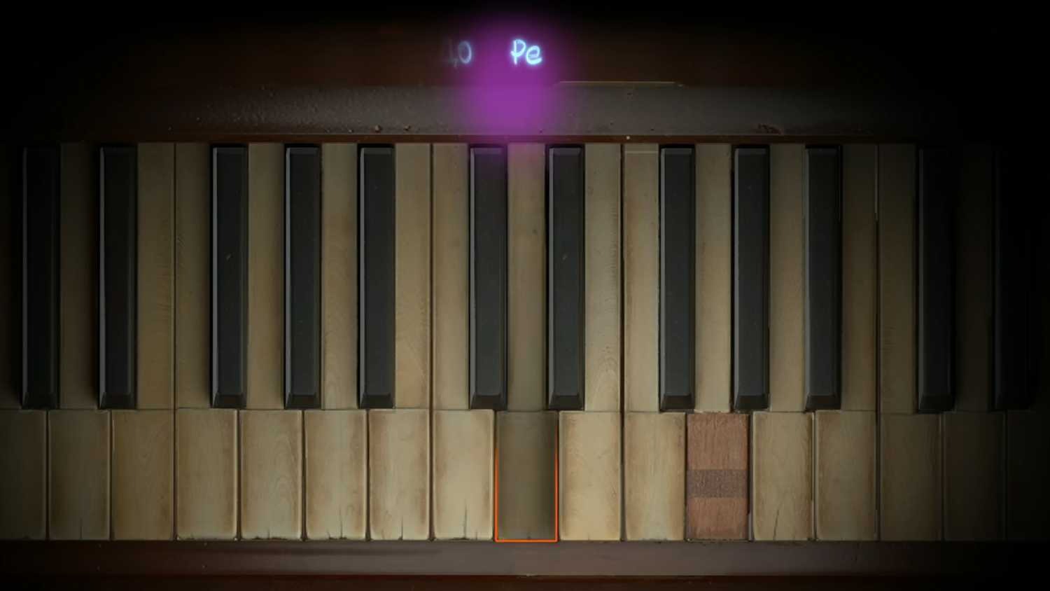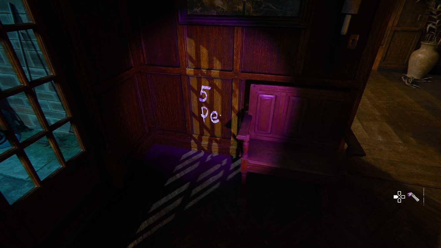 Usando a Luz Negra, escaneie as paredes a partir da área acima do piano, movendo-se para a direita. Você encontrará cinco símbolos numerados em ordem crescente. Esses números indicam a ordem em que você deve pressionar as teclas correspondentes no piano.