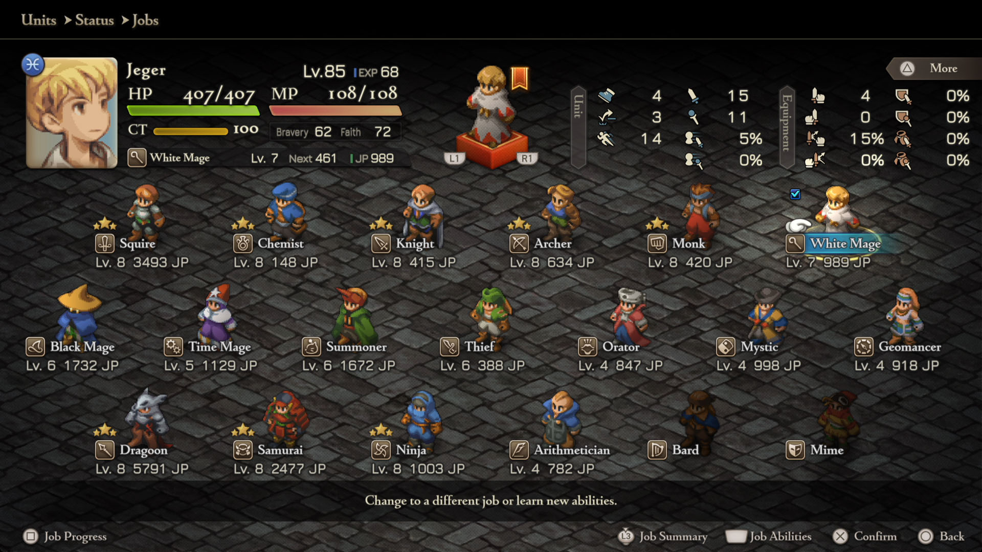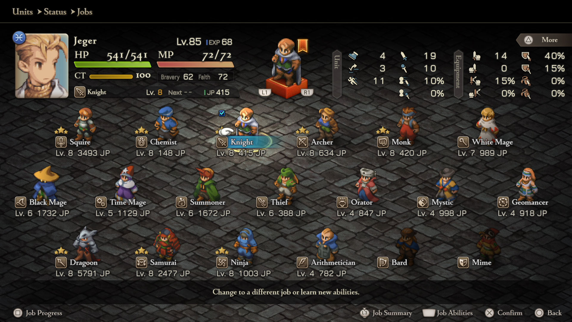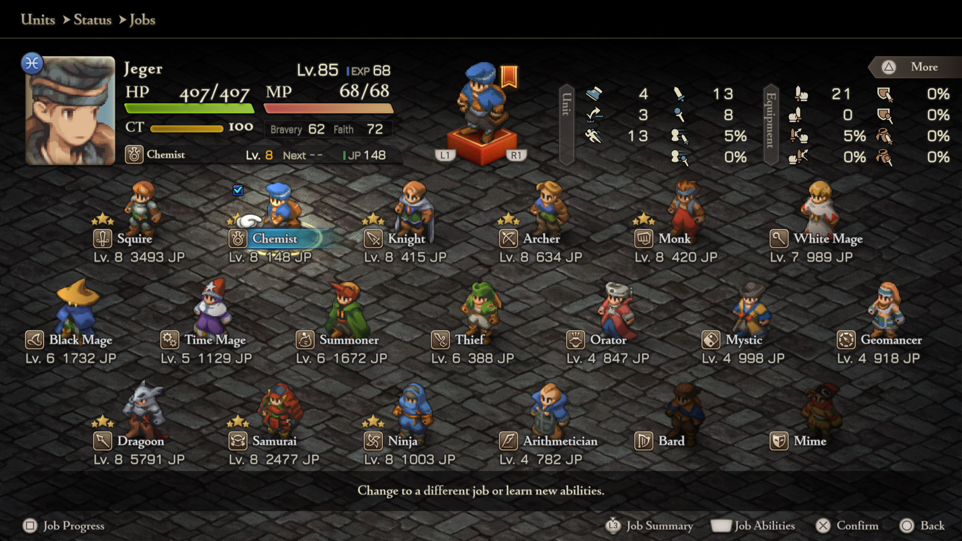 Em Final Fantasy Tactics: The Ivalice Chronicles, cada personagem possui diferentes Jobs (Classes) que lhe conferem diferentes habilidades.