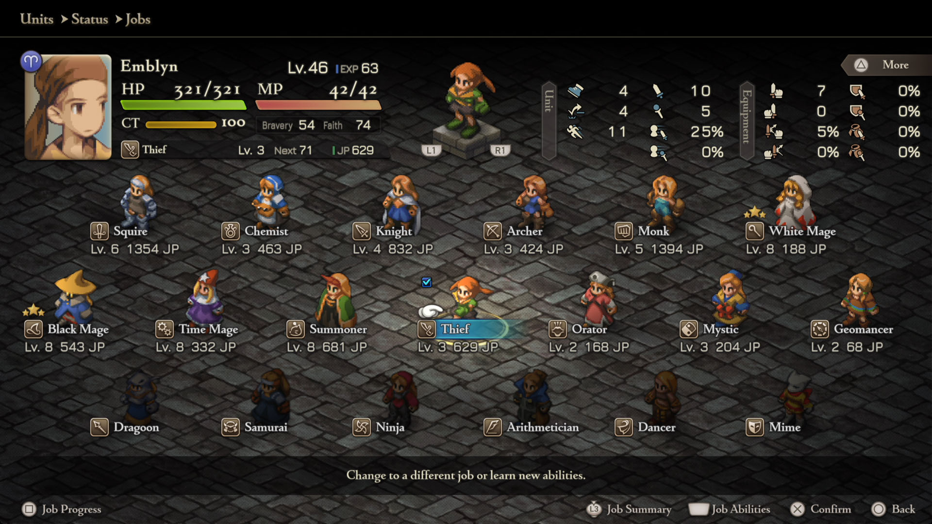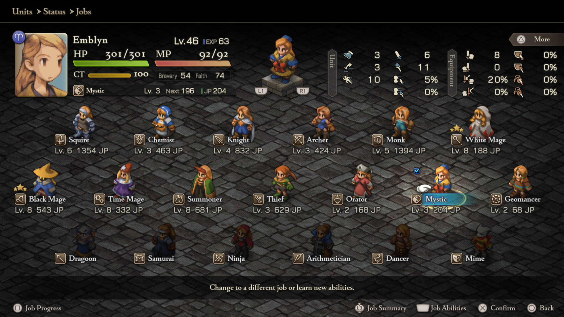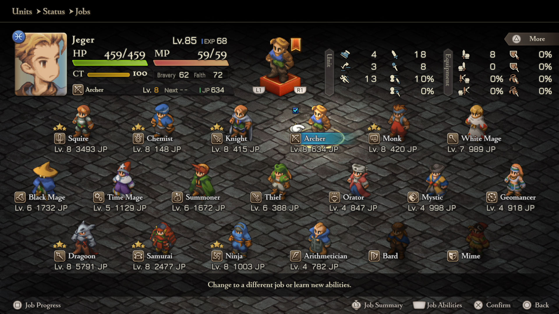 Em Final Fantasy Tactics: The Ivalice Chronicles, cada personagem possui diferentes Jobs (Classes) que lhe conferem diferentes habilidades.