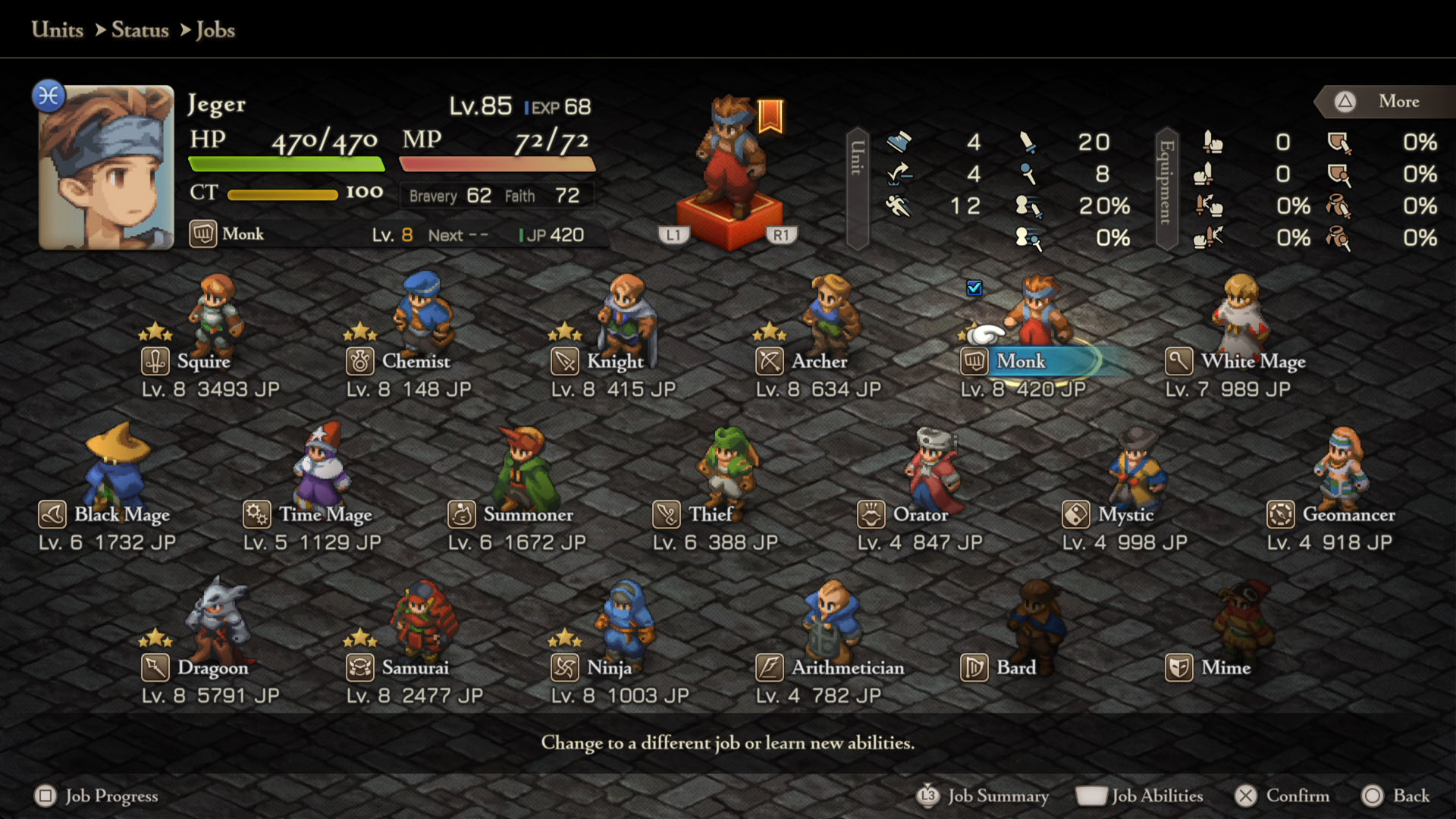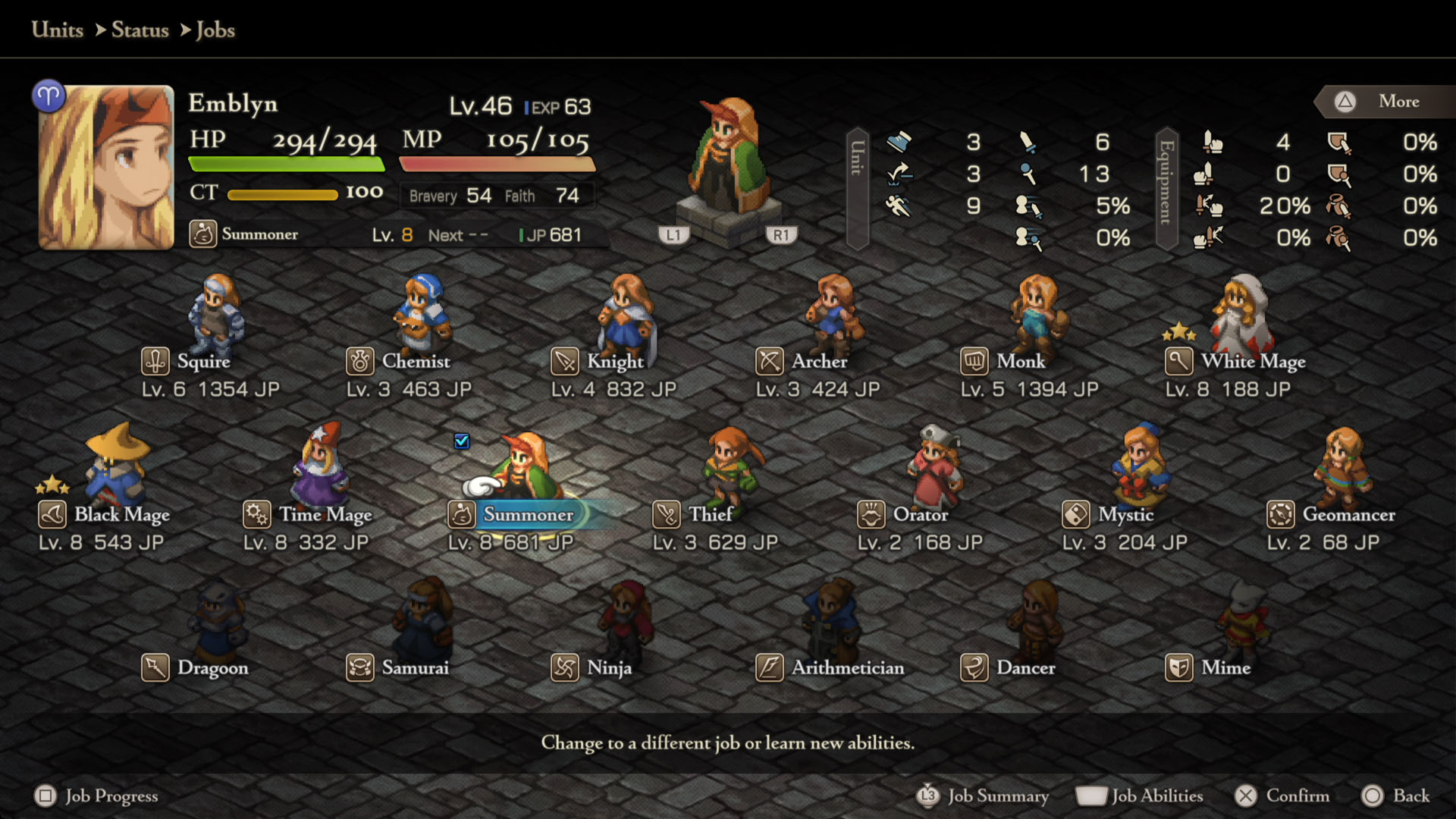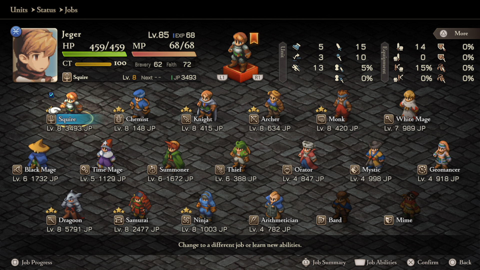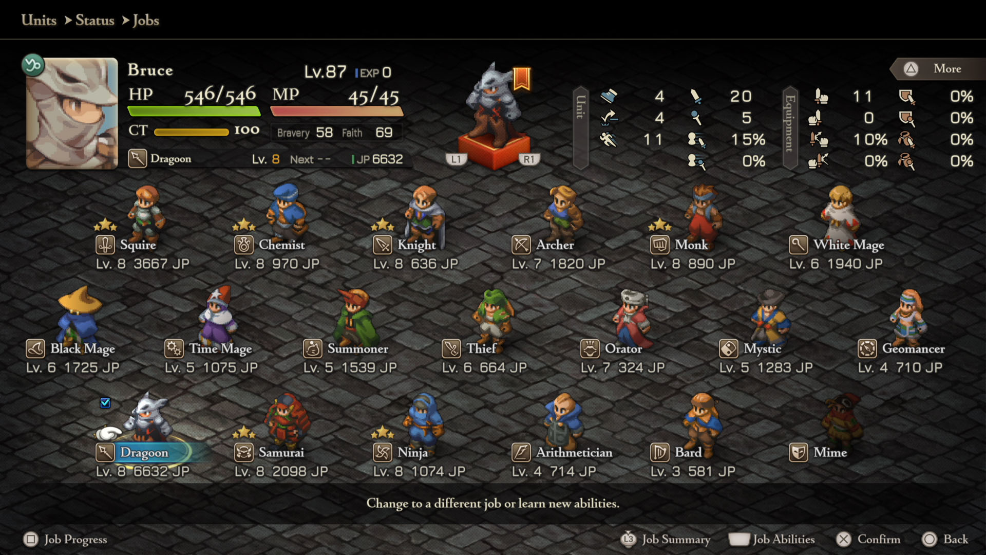 - Mime – Squire Lvl 8, Chemist Lvl 8, Geomancer Lvl 5, Dragoon Lvl 5, Orator Lvl 5, Summoner Lvl 5