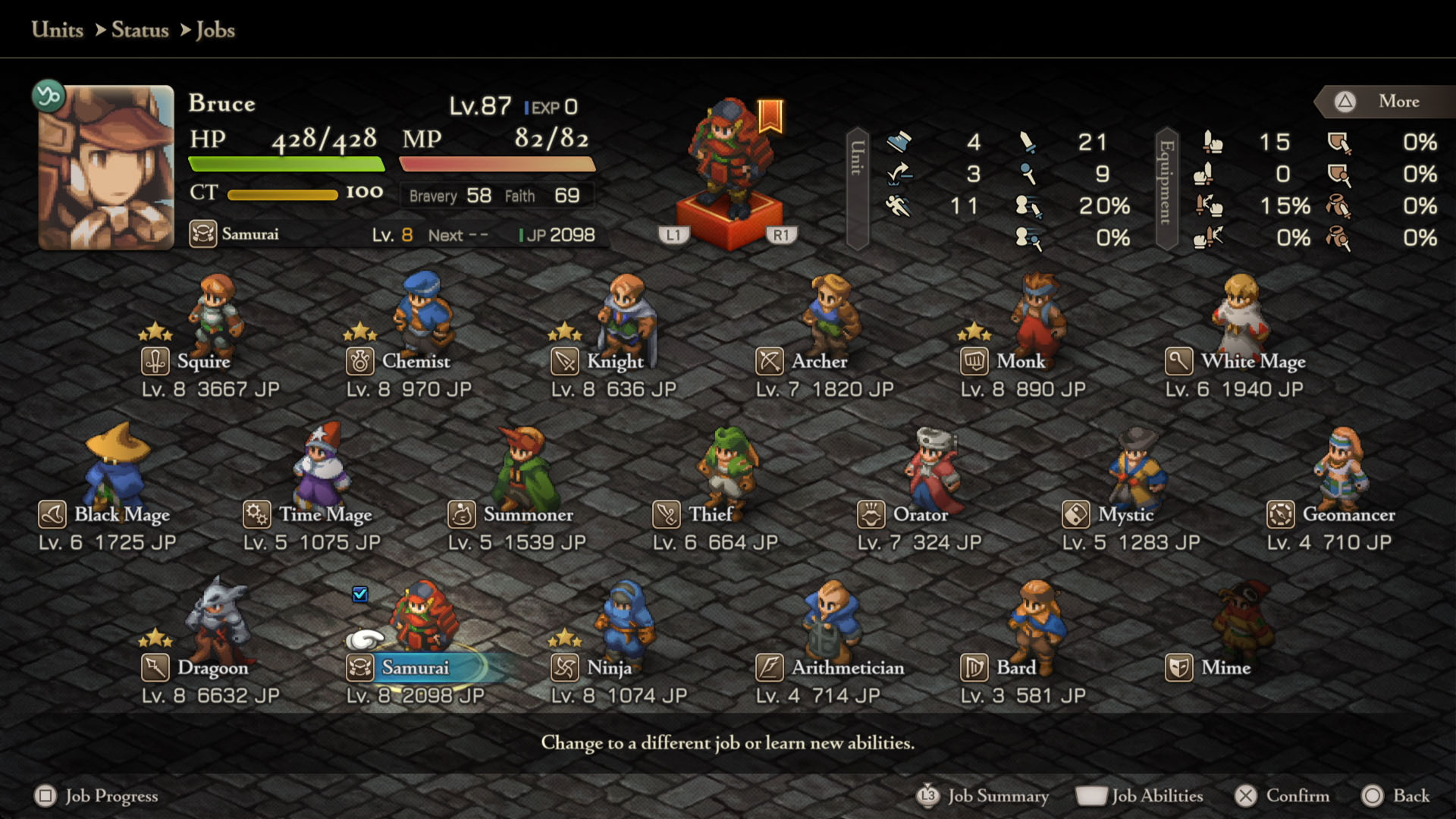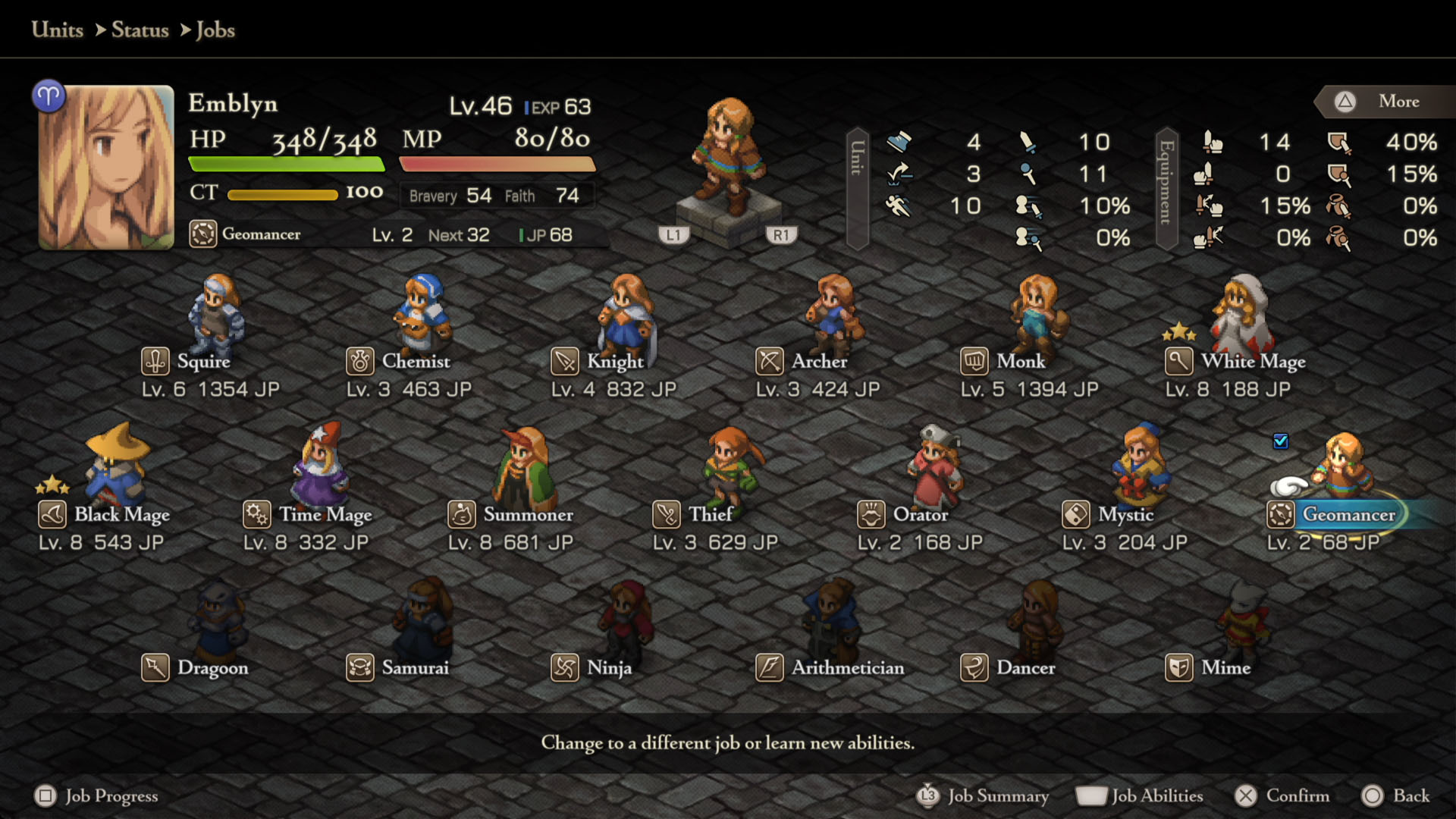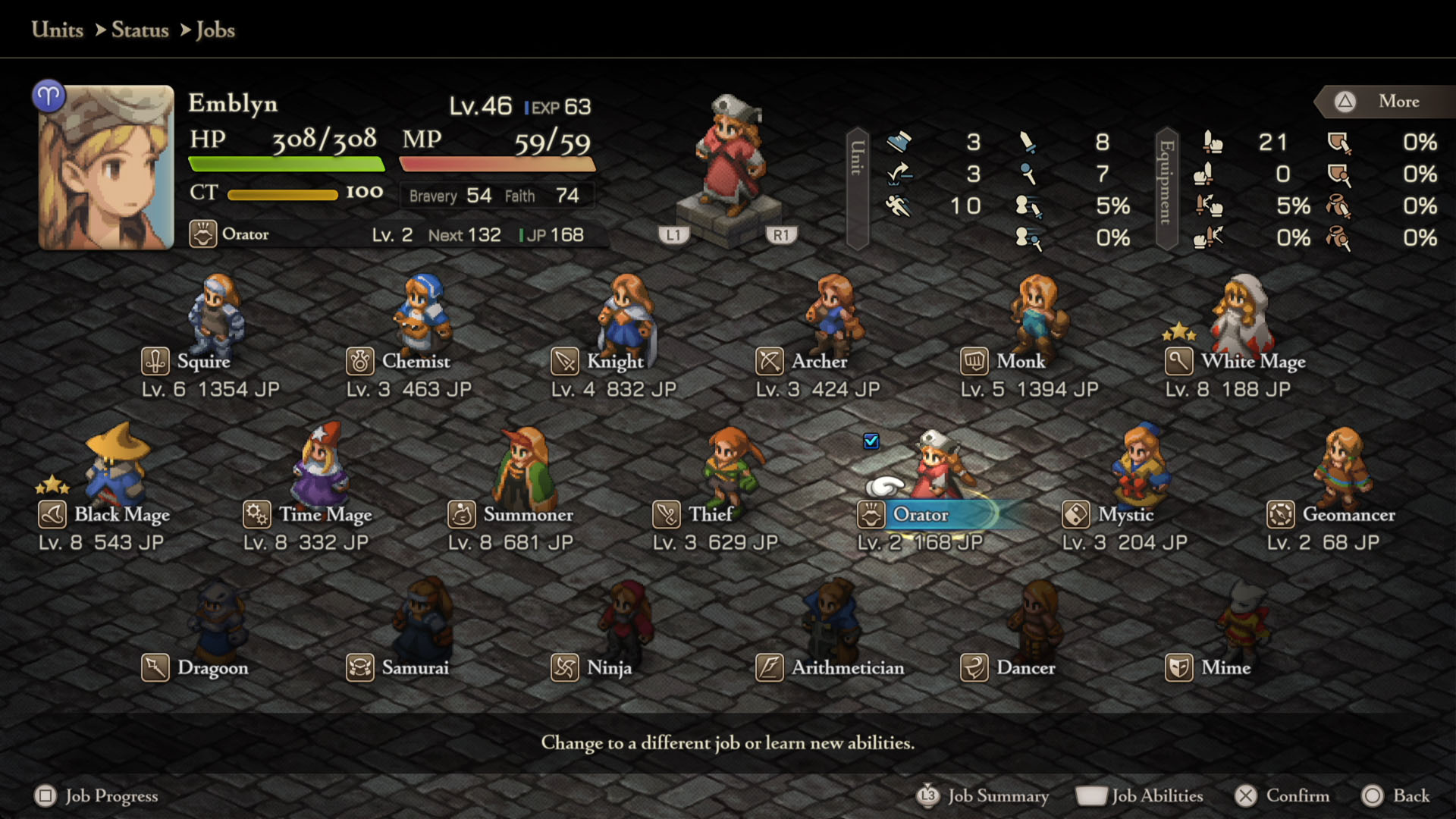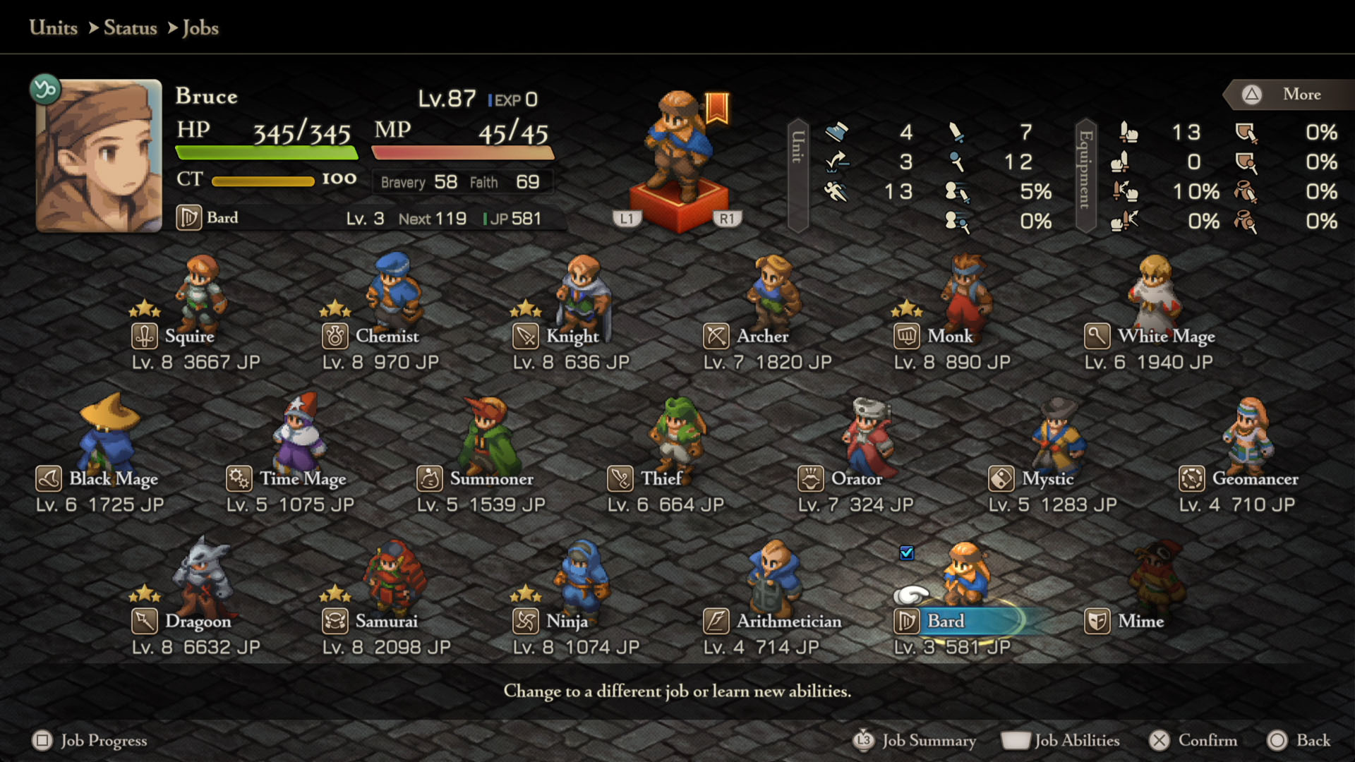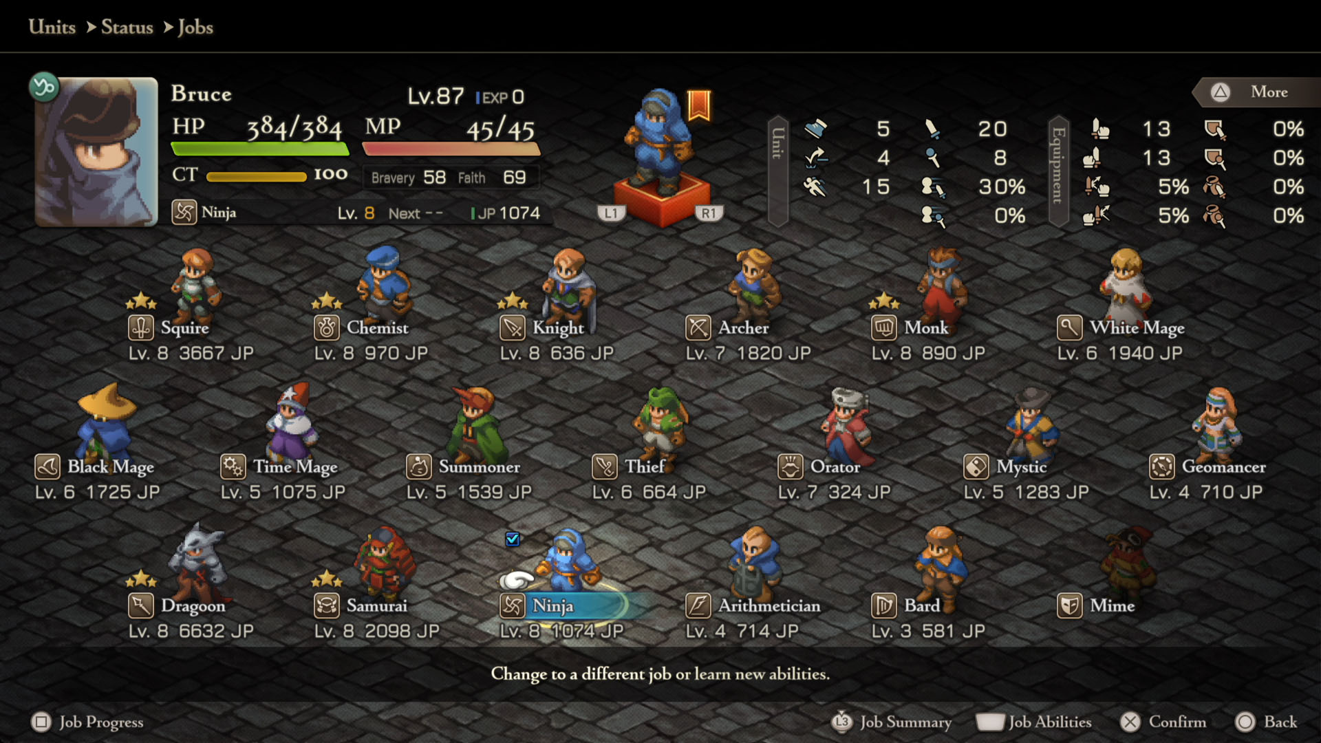 - Mime – Squire Lvl 8, Chemist Lvl 8, Geomancer Lvl 5, Dragoon Lvl 5, Orator Lvl 5, Summoner Lvl 5