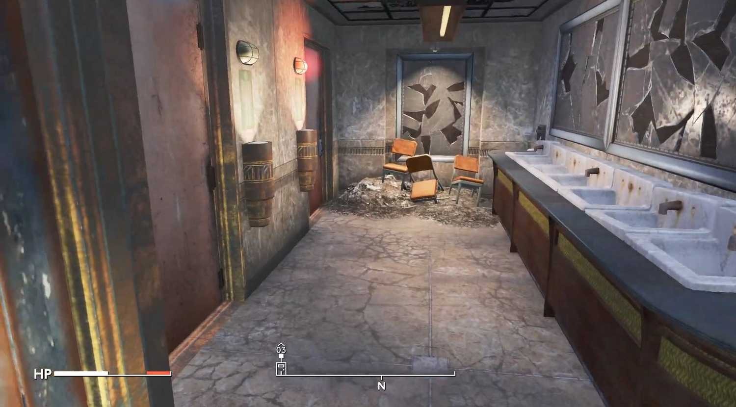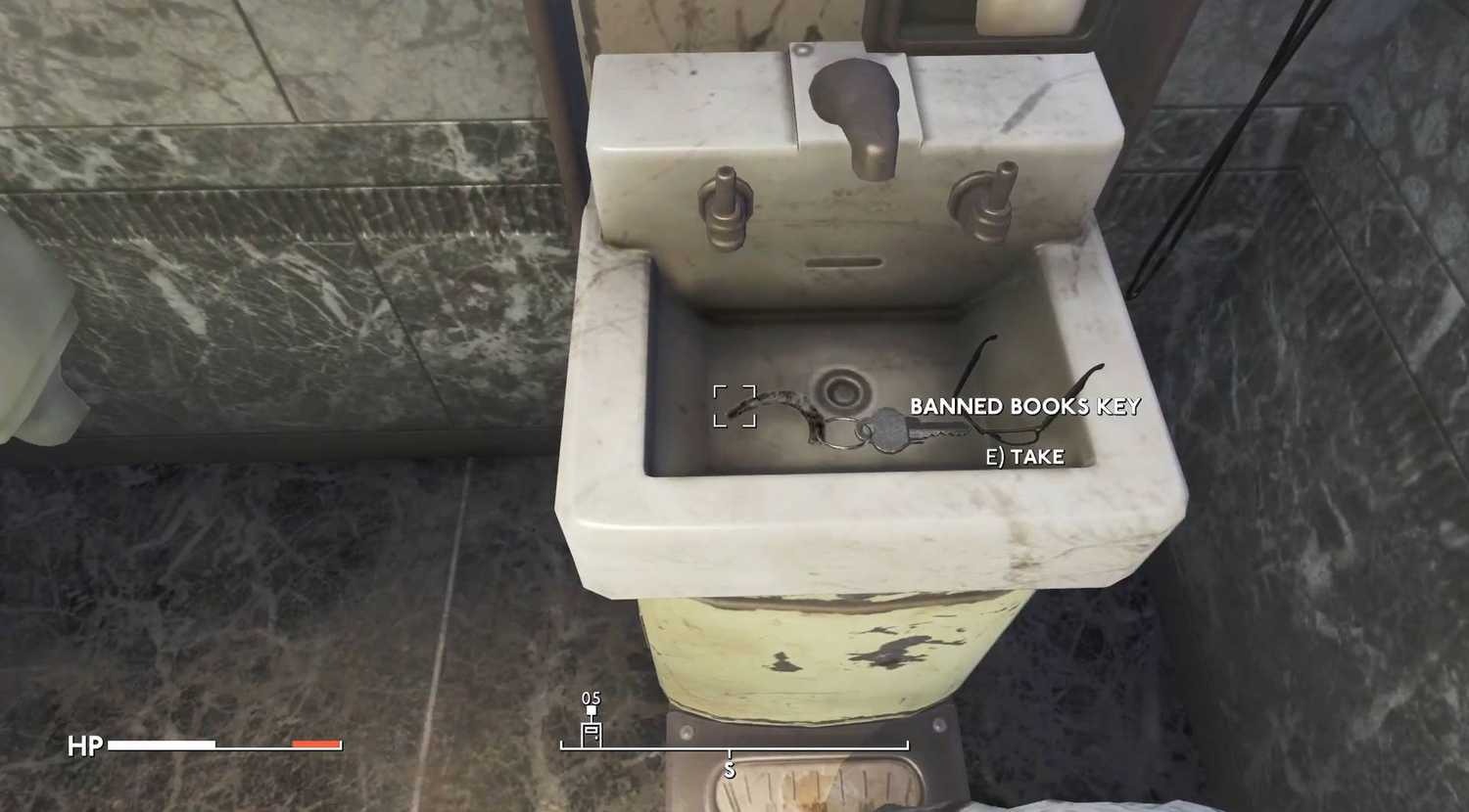O banheiro direito contém um estoque útil de explosivos, enquanto o banheiro esquerdo contém o cadáver do bibliotecário-chefe e um ghoul furioso. Na pia, você encontrará a chave da Sala de Livros Proibidos.