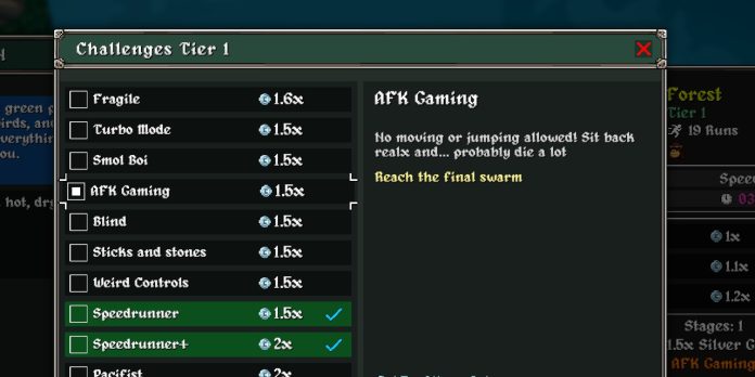 O Desafio AFK consiste em eliminar inimigos até chegar à última horda, sem mover-se ou pular durante toda a partida. Você pode, no entanto, coletar itens que caem próximos ao personagem, desde que não precise se deslocar. O segredo é fortalecer sua build ao máximo antes de iniciar o desafio, priorizando Tomos e armas que causem dano automático e aumentem a resistência.