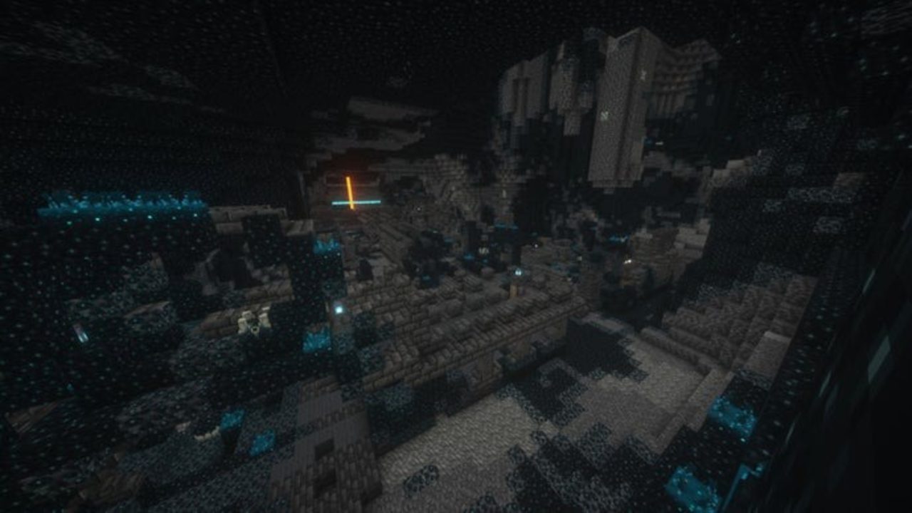 Comece sobre uma Floresta Escura e logo abaixo encontre um bioma de Escuridão Profunda com cidades antigas.