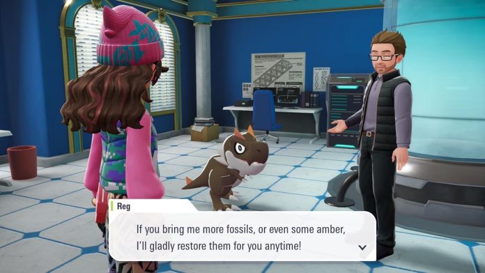 Com o item em mãos, retorne ao laboratório e entregue o fóssil a Reg. Ele usará a máquina para restaurar o Pokémon correspondente.