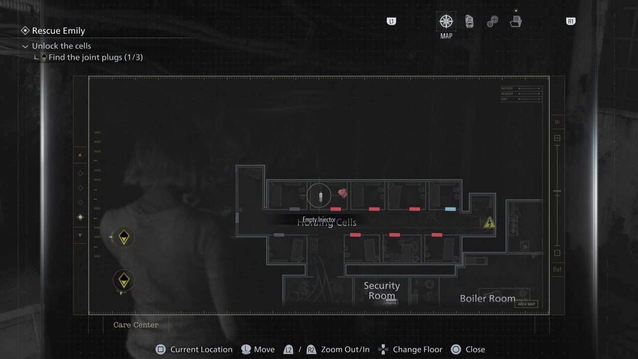 Ao se aproximar das celas onde está o terceiro Conector Articulado, um zumbi escapará e atacará Grace. Após lidar com a ameaça, entre na cela aberta para coletar o Injetor Vazio.