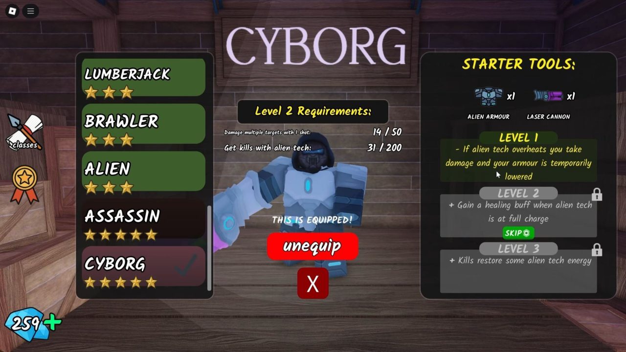 A classe Ciborgue custa 600 Gemas para desbloquear e possui raridade de 5 estrelas. O jogador inicia com a Armadura Alienígena e um Canhão Laser, uma arma com munição infinita. Embora seja necessário recarregar a energia do canhão, a ausência de necessidade de munição torna essa arma extremamente vantajosa em longas sessões de jogo.