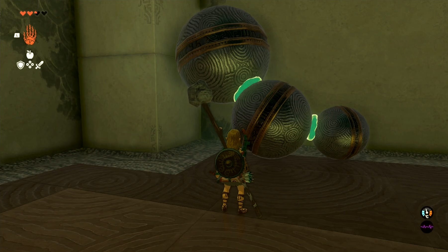 Por fim, funda a menor bola com as outras duas e, em seguida, use o Ultrahand para caminhar até o alvo laranja na parte inferior da rampa. Basta soltar as três bolas do centro do alvo para abrir a última porta, sem necessidade de rolagem.