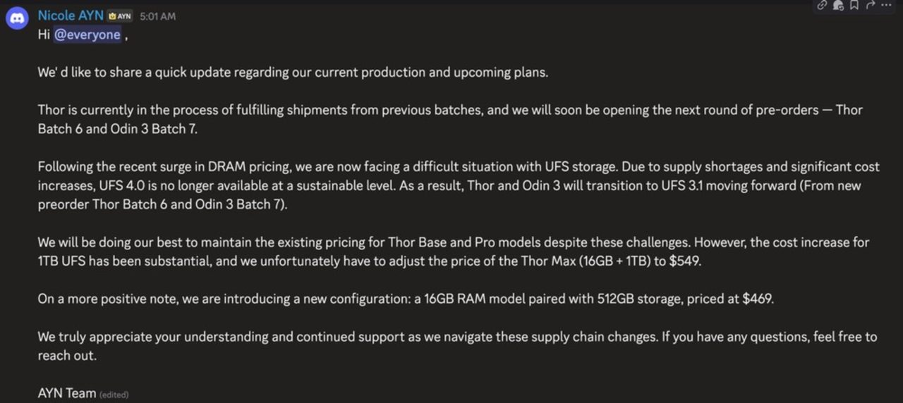 Além do aumento no Thor Max, a AYN anunciou uma alteração técnica nos modelos Lite e Pro do Thor para evitar reajustes de preço nessas versões. A partir do Batch 6 do Thor e do Batch 7 do Odin 3, o armazenamento UFS 4.0 será substituído pelo UFS 3.1. Segundo a empresa, o UFS 4.0 não está mais disponível em quantidade suficiente para manter a produção em níveis sustentáveis.