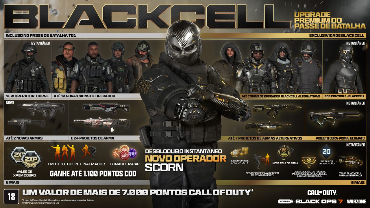 A versão premium BlackCell oferece mais de 130 recompensas e desbloqueios instantâneos, incluindo o operador Scorn, o projeto obra-prima “Ultimato” para a SMG Carbon 57 e um conjunto de sete visuais para operadores. A oferta também garante 20 saltos de nível, 1.100 COD Points, novo golpe finalizador de companheiro e interface temática BlackCell.