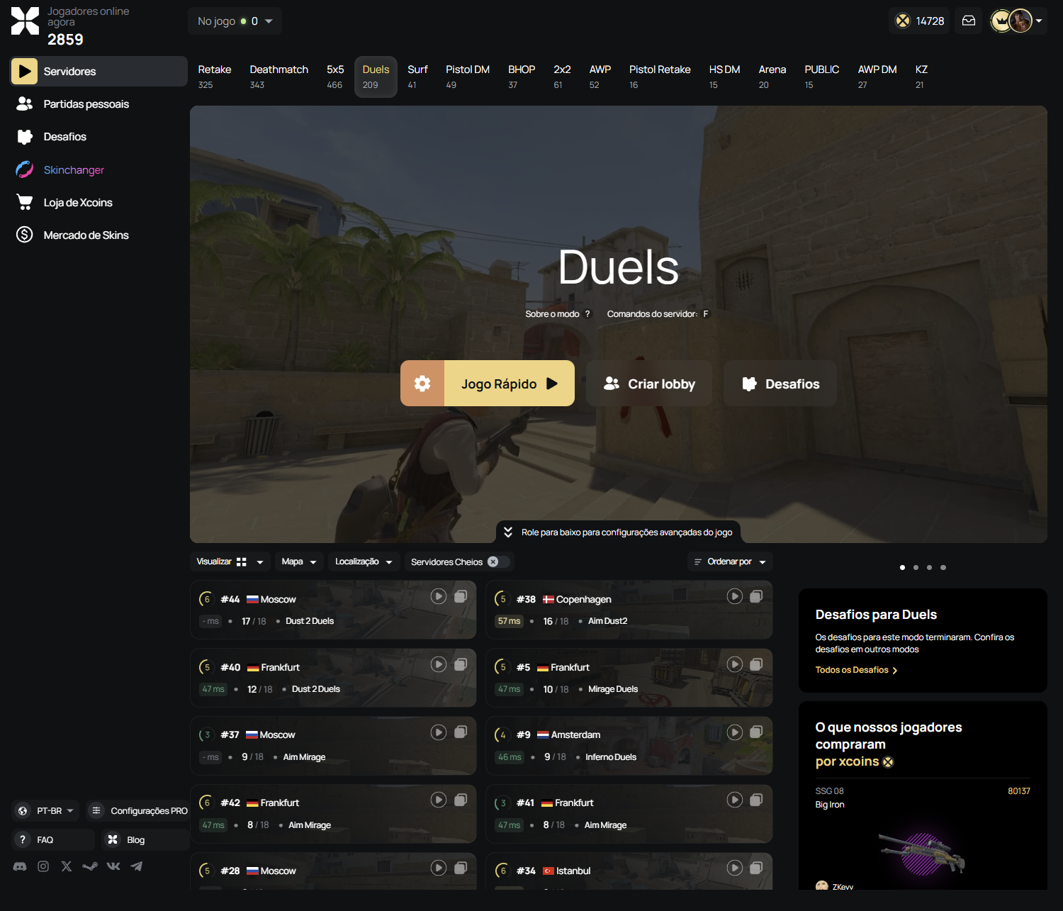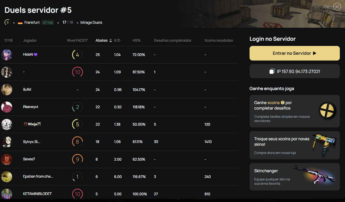 Entre os CS2 community servers, poucos oferecem um ambiente tão completo quanto o da xplay.gg. O modo Duels combina o que há de mais eficiente para evoluir individualmente: confrontos rápidos, estabilidade técnica, recompensas motivadoras e personalização visual.