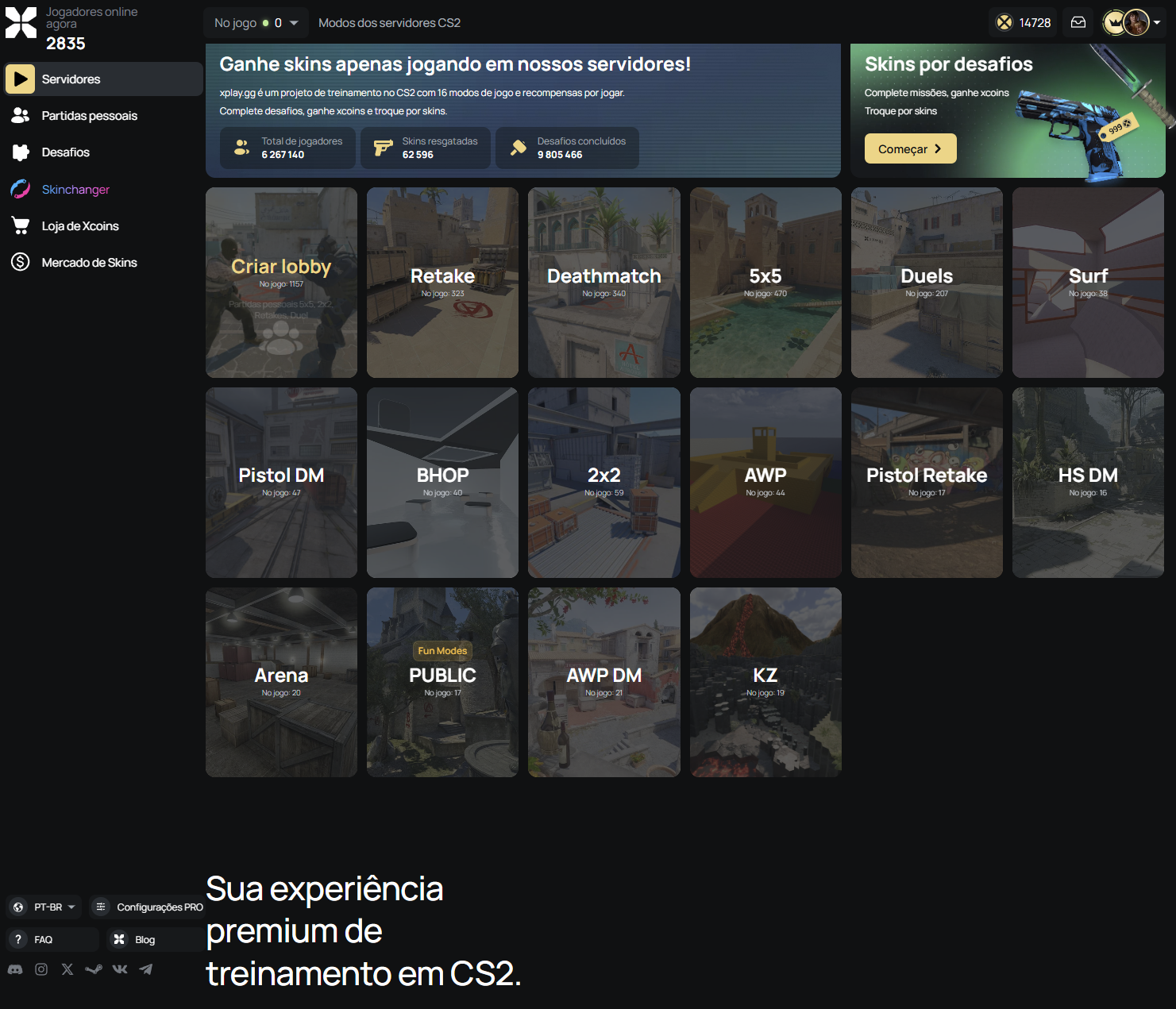 Outro ponto de destaque é a variedade da plataforma: além do modo Duels, há servidores de treino em equipe, movimentação e cenários personalizados — tudo dentro do mesmo ambiente. Assim, qualquer jogador pode montar sua rotina completa de evolução no CS2 sem sair da xplay.gg.