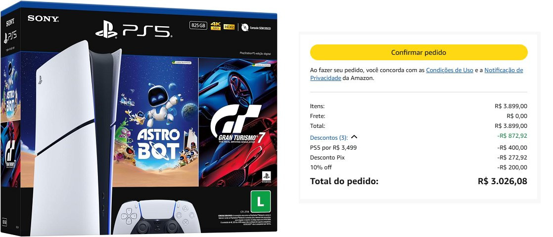- PS5 Digital com Astro Bot e Gran Turismo 7 por R$3026,08 (cupom AMAZON10)