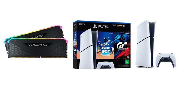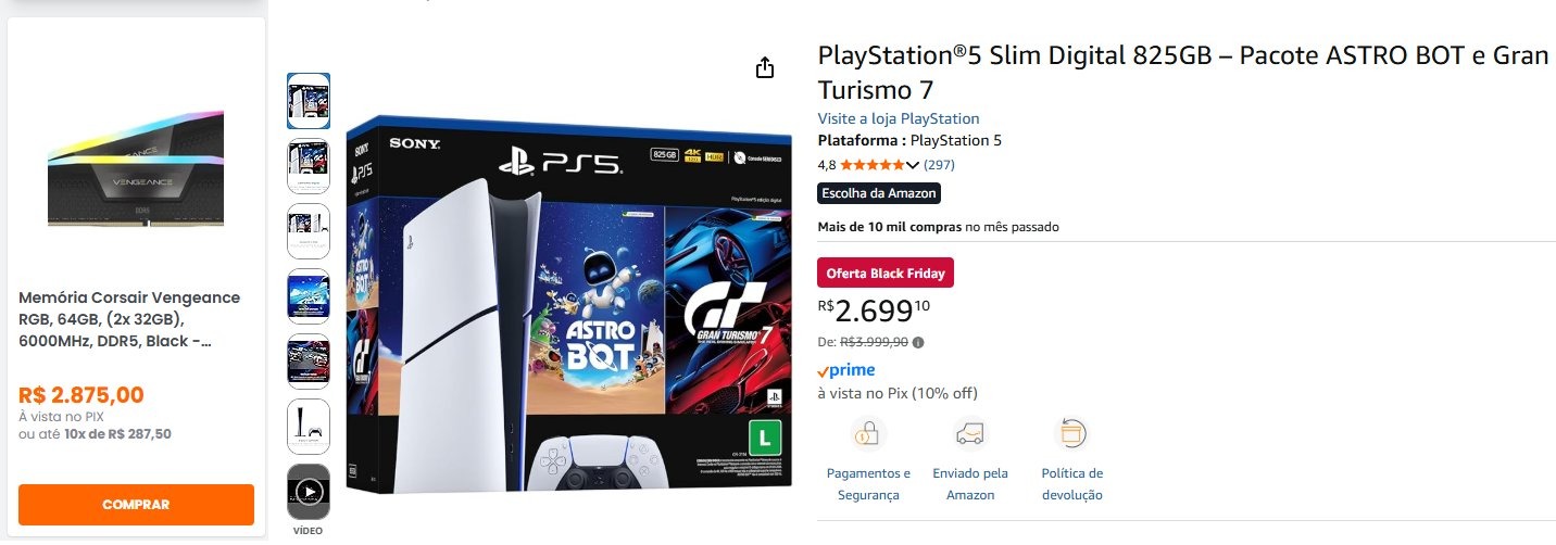 Como você pode ver na imagem abaixo, feita por mim, no Brasil um PS5 custa R$2699 em promoção de Black Friday na Amazon, enquanto um kit de 2 memória de 32GB DDR5 estão custando R$2875 na Kabum.
