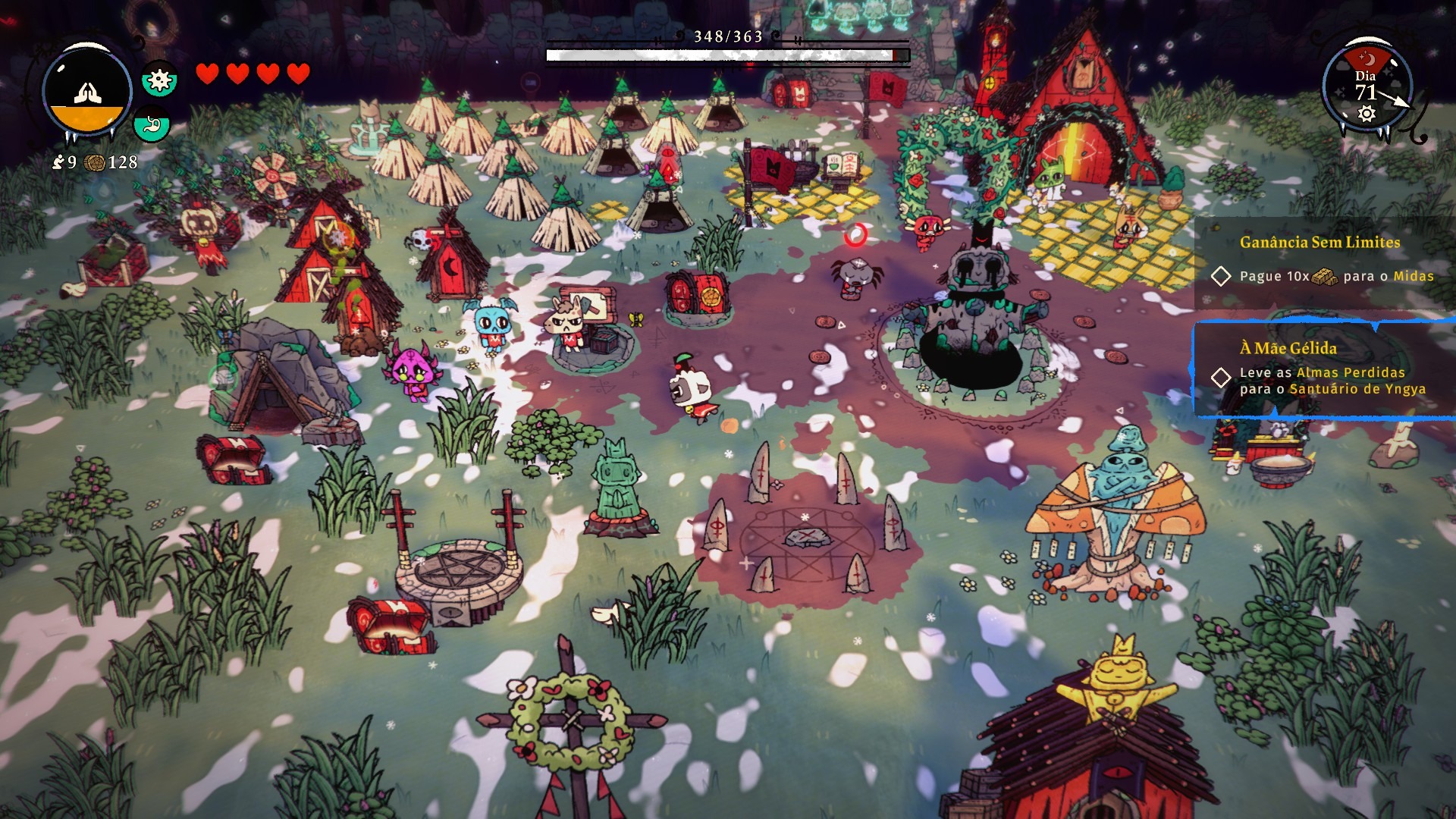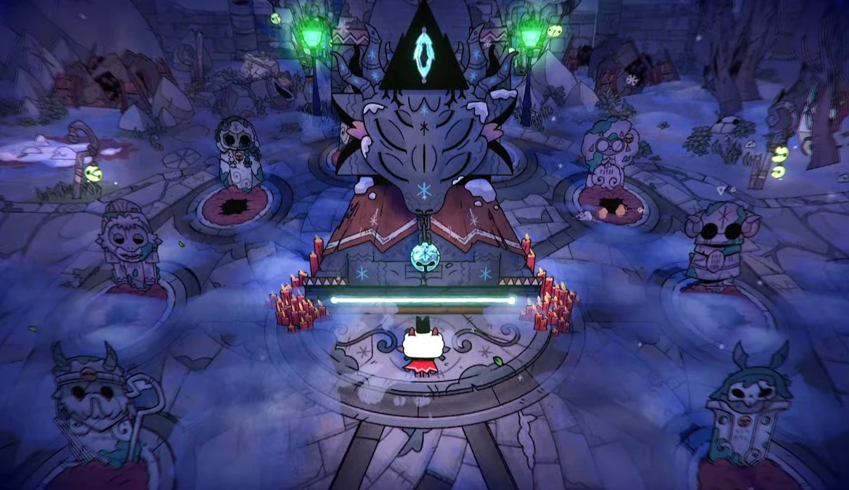 De qualquer forma, fica claro que o foco de Cult of the Lamb: Woolhaven não é adicionar novos conteúdos de qualquer forma e somente dar novos motivos para que o jogador saia desembestado atrás de sangue pelas dungeons do jogo. É praticamente impossível avançar efetivamente sem que o culto esteja bem. Na verdade, manter o culto ativo e funcional se torna muito mais desafiador em Woolhaven, não só pelo inverno, mas também pelos novos tipos de “Seguidores Podres” que se apresentam.