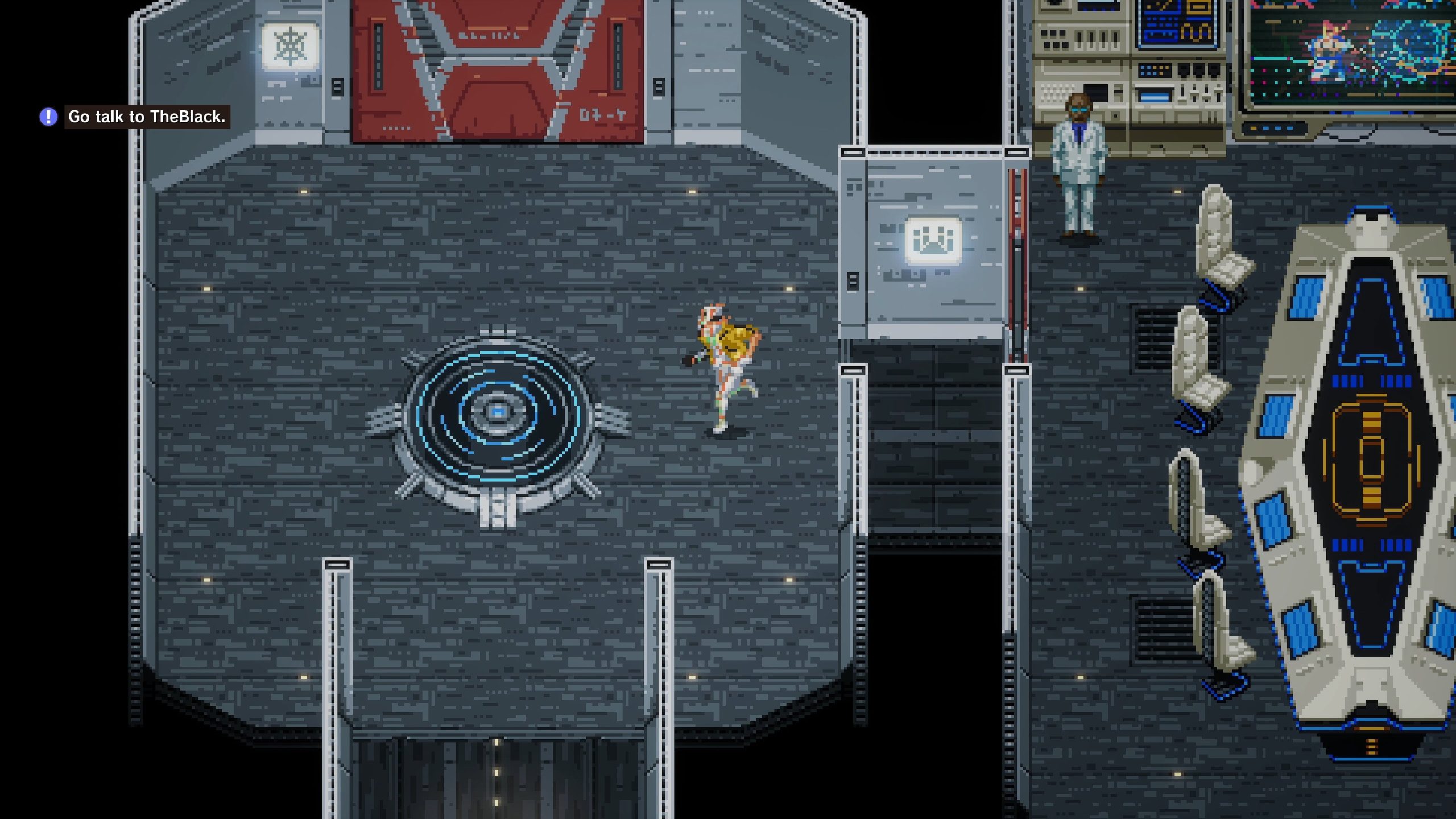Como esse é um jogo do Suda51, ele apresenta uma série de ideias diferentonas, e o tradicional de soulslike é basicamente os mapas e os chefes, o resto todo acaba trazendo alguma novidade interessante. Para começar, entre uma fase e outra, você volta para a nave da Patrulha do Espaço-Tempo do FBI e deve conversar com seus colegas de tripulação, comprar e vender itens, cultivar podrões (os zumbis que você pode usar para te ajudarem no combate) e assim por diante, e tudo isso acontece numa versão 2D do jogo.