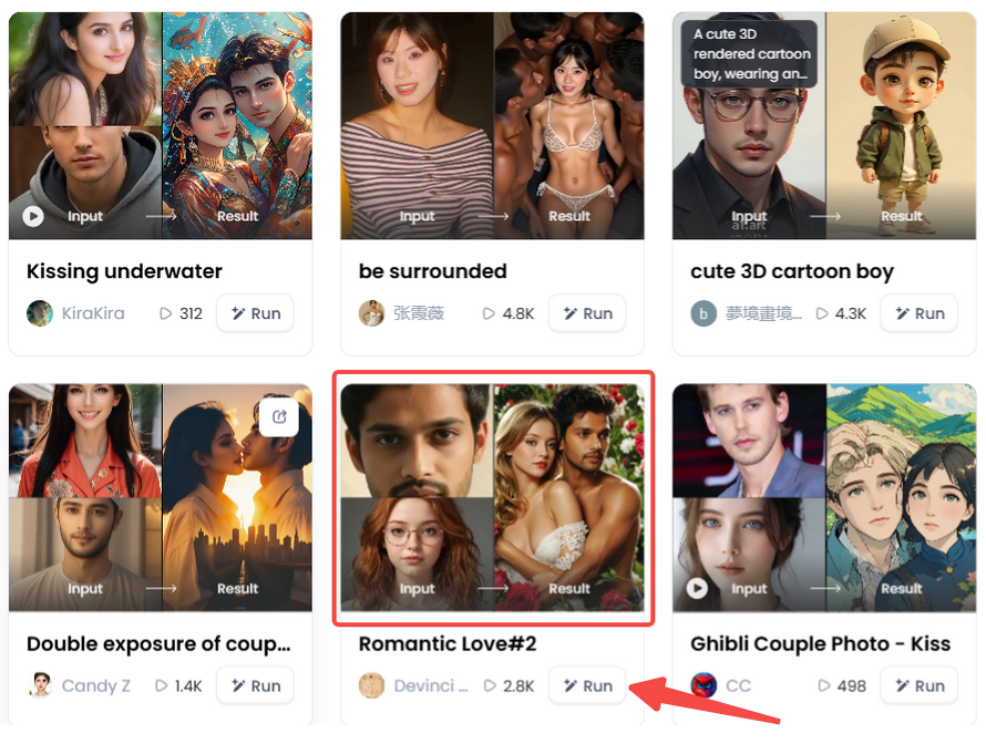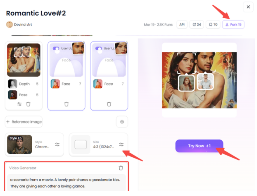 Vá ao site do a1.art e explore a seção “Comunidade” ou “Filtros”. Procure um resultado que você goste — uma animação romântica, um casal em estilo Ghibli, um beijo de cinema. Quando encontrar, clique no botão “Fork”. Ele carrega automaticamente a mesma receita que criou aquele vídeo, com tudo pronto para você usar sua própria foto.