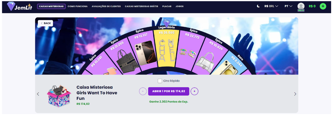 O sistema do JemLit aceita Pix e exibe os valores já convertidos em real, facilitando a entrada do público brasileiro. Além disso, a interface é intuitiva, o cadastro é simples e a navegação pela plataforma permite que mesmo quem nunca comprou caixas misteriosas se sinta segura e confortável.