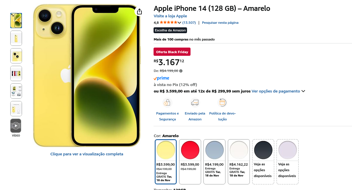 - Compre aqui: Apple iPhone 14 (128 GB) Amarelo na Amazon