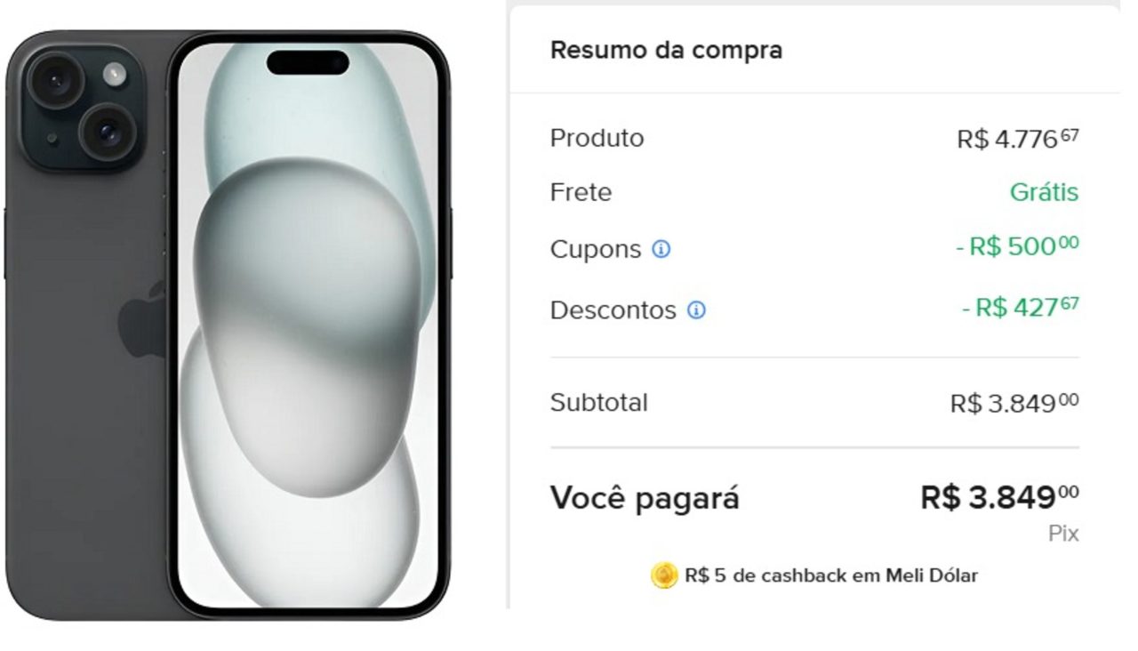 Ao usar o cupom OFF500 na plataforma, o aparelho sai por iPhone 15 pagando no pix, confira abaixo: