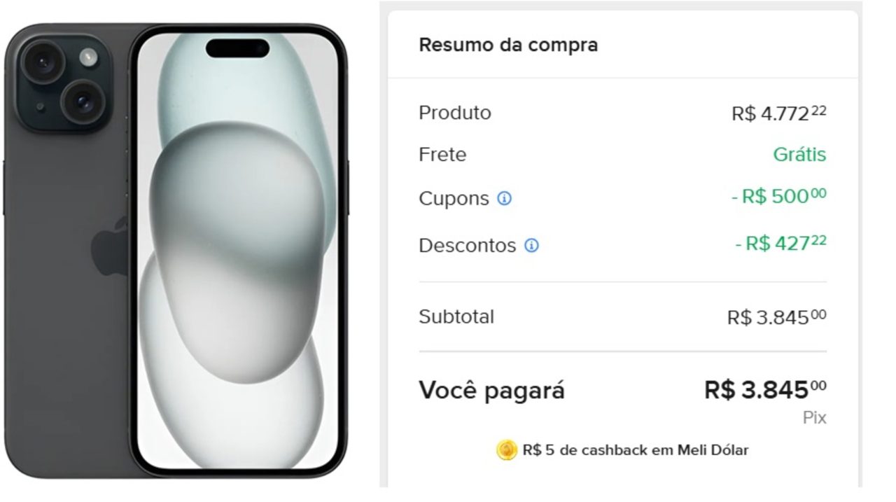 Ao usar o cupom 500OFF na plataforma, o aparelho sai por iPhone 15 pagando no pix, confira abaixo: