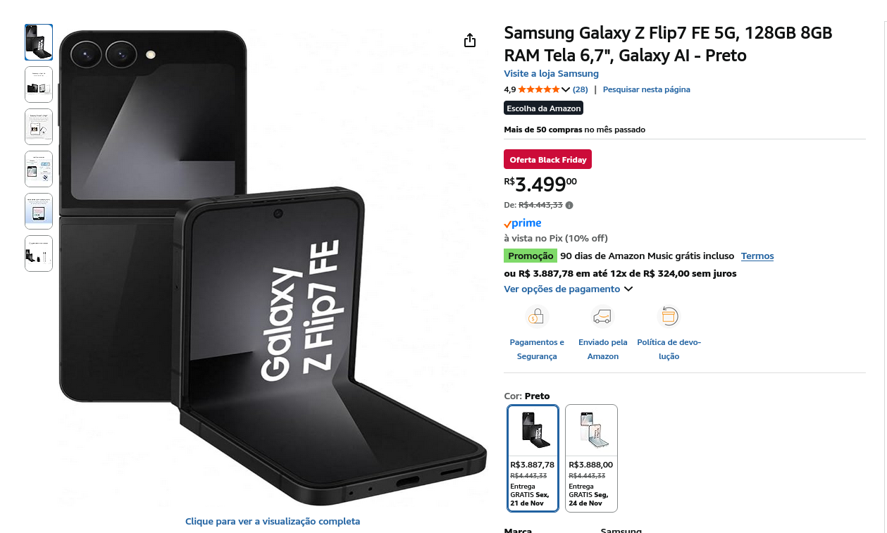 Por R$ 3.499,20, o Samsung Galaxy Z Flip7 FE 5G se posiciona como a opção ideal para quem quer um celular moderno, potente e com o charme exclusivo de um dobrável. Essa é uma das melhores oportunidades para entrar no universo dos smartphones premium da Samsung.